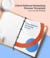 Client Referral Marketing Planner Template — 21 printable pages for ideal client profile, weekly goals, referral sources, rewards, expenses, tracker, posting schedules, reviews, and notes.