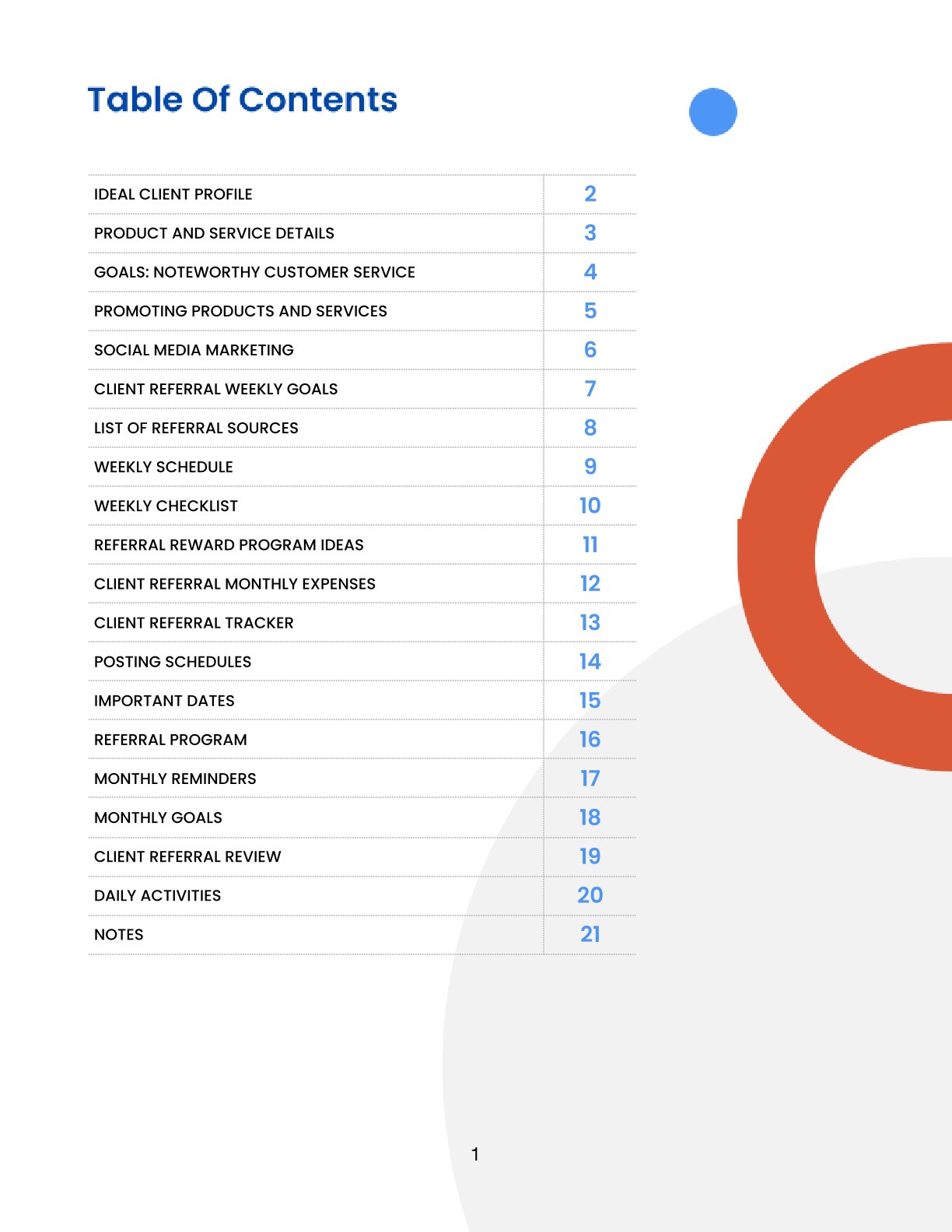 Year & Name cover; Ideal Client Profile (demographics and needs); Product & Service Details with unique qualities and price; Goals: Noteworthy Customer Service with monthly action plans; Promoting Products & Services (digital and traditional strategies); Social Media Marketing brief with virality prompt; Client Referral Weekly Goals; List of Referral Sources; Weekly Schedule; Weekly Checklist (main focus, reminders, next week’s plans); Referral Reward Program Ideas; Client Referral Monthly Expenses; Client Referral Tracker (date, referrer, referred person, contact); Posting Schedules; Important Dates (Jan–Dec); Referral Program one-pager (goal, benefits, CTA, landing page); Monthly Reminders calendar; Monthly Goals (why + action steps); Client Referral Review (monthly tallies); Daily Activities (to-dos, calls, purchases, plans for tomorrow); Notes.