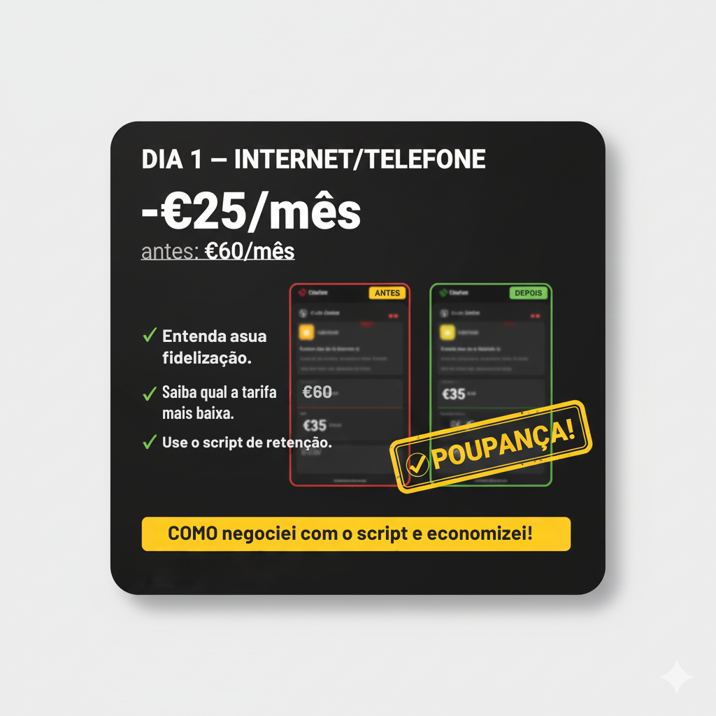 Dia 1: Internet/telemóvel — comparar tarifa mínima + script de retenção.
