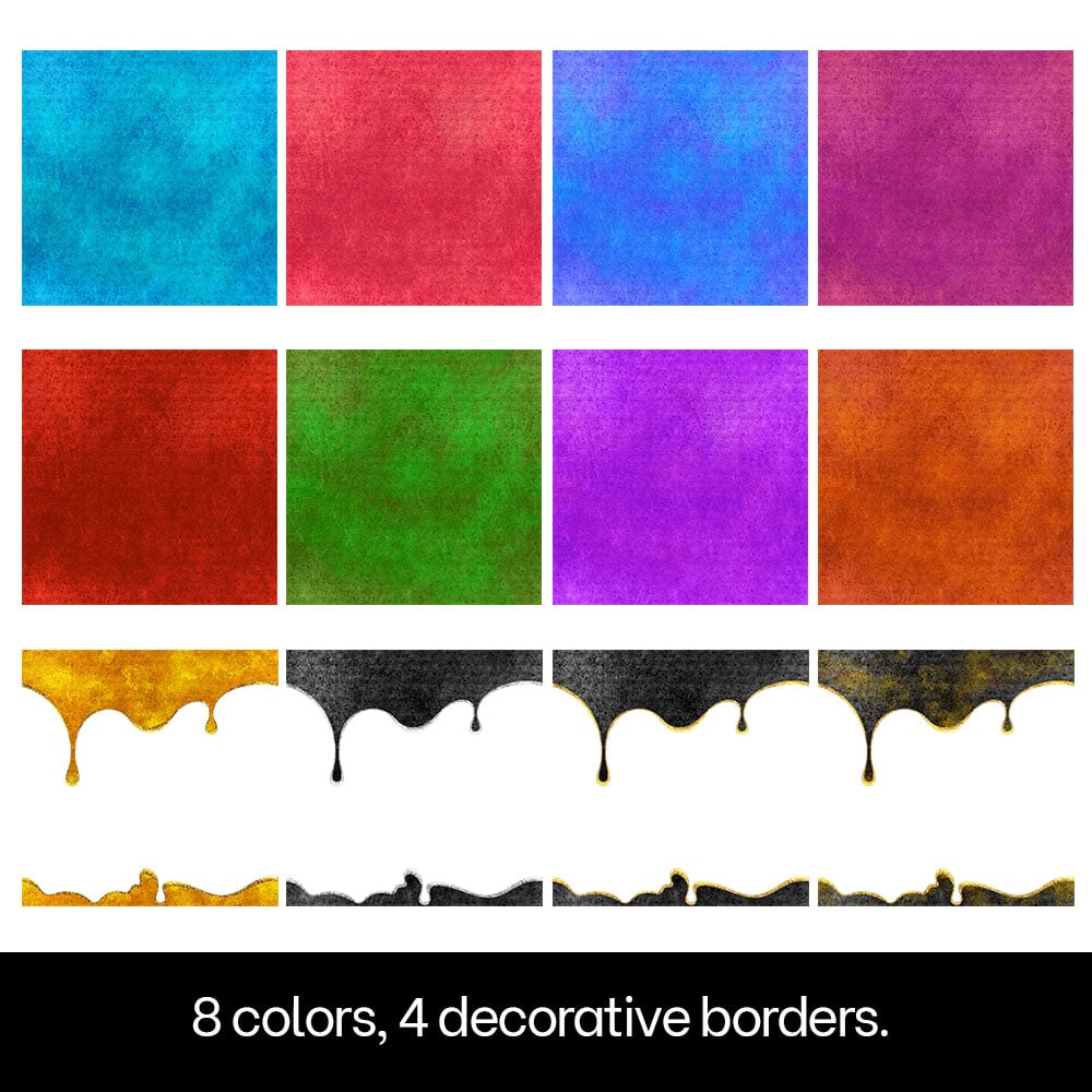 This is a set of 8 bright colored digital papers with seamless texture and  4 decorative PNG borders, also seamless. The papers and the borders are combined to create a pack of 40 digital papers that you can use as backgrounds in your creative projects. Have fun creating! ❤