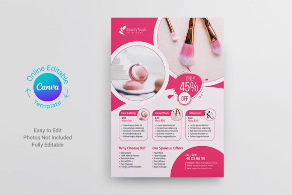 This is a creative and modern beauty flyer template suitable for all industries. All you need to know is the very basics of Canva to change the text, color, images, and everything.