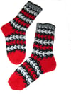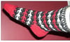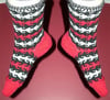 The socks are knit with 2.25mm double pointed needles, with three colors of a fingering weight yarn that knits at 8 stitches to the inch. This pattern uses stranded knitting and short row techniques; the socks are knit with two colors in each row.