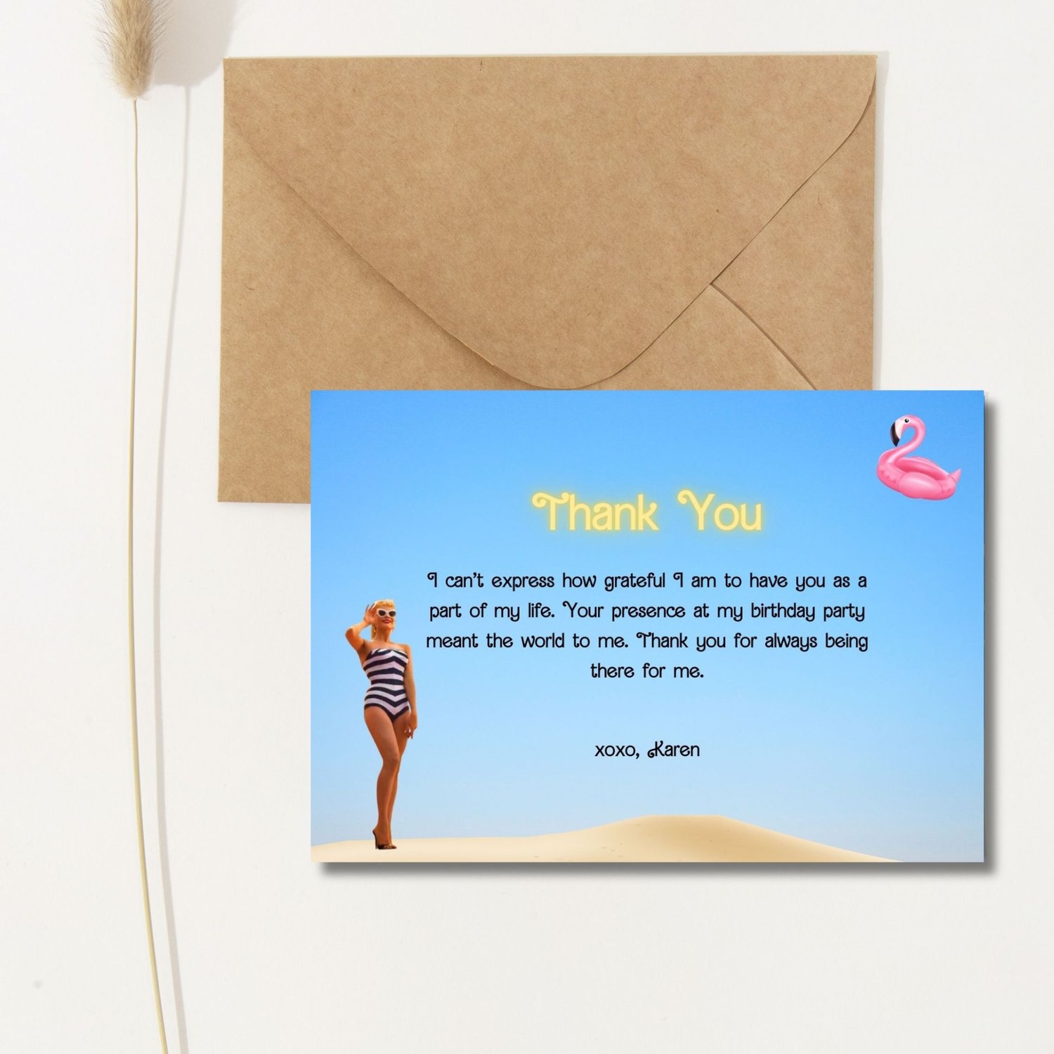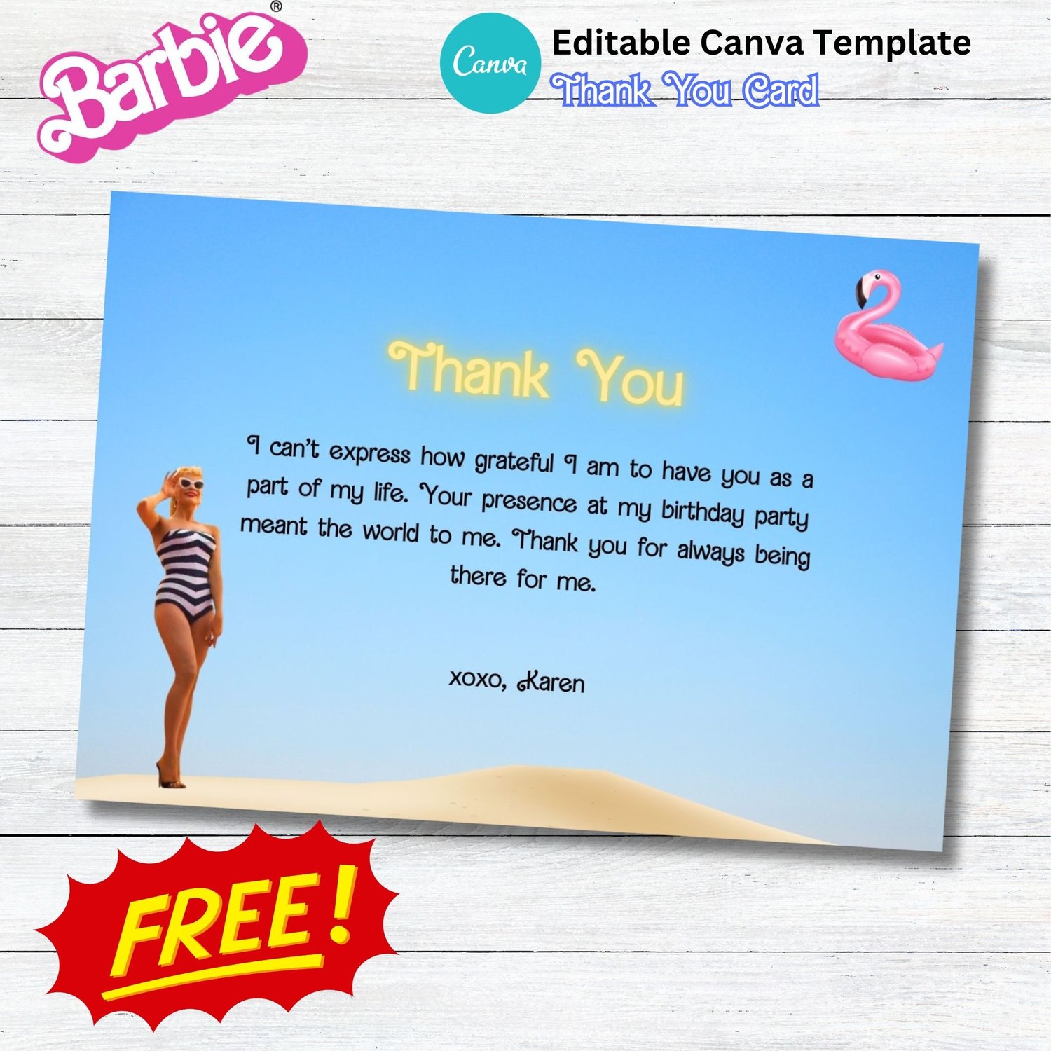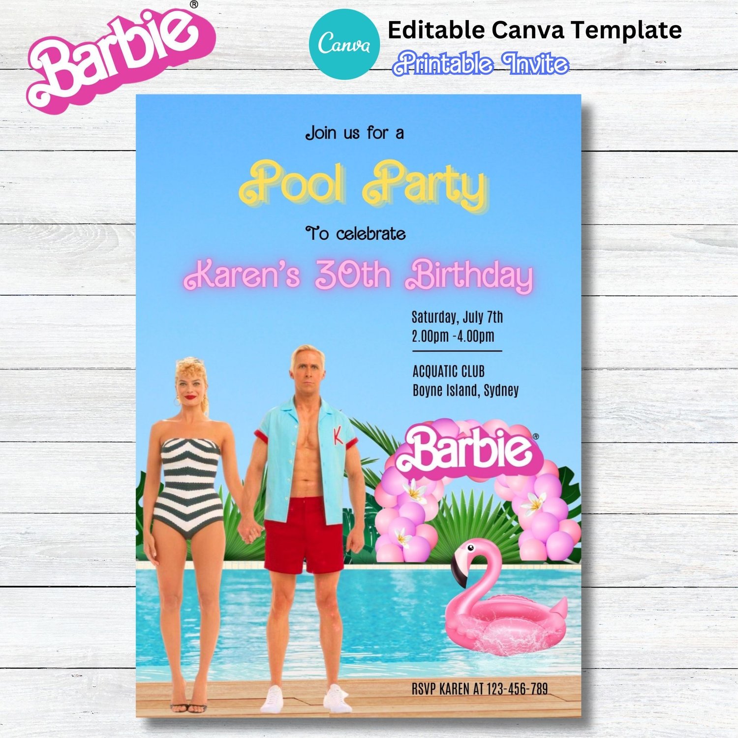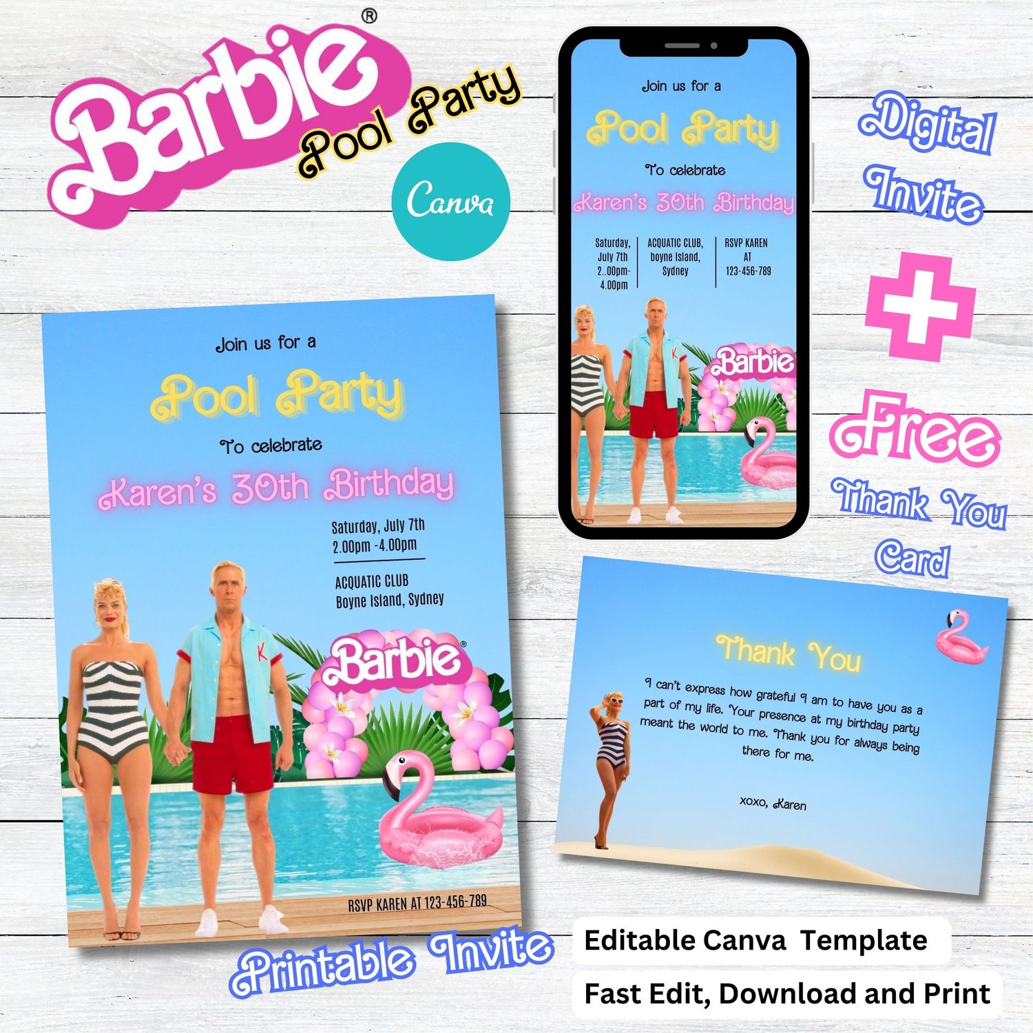 The Barbie-themed design captures the fun and excitement of a pool party. The vibrant colors and playful illustrations featuring Barbie herself will surely get everyone excited for the celebration. THINK BARBIE GIRL IN BARBIE MALIBU.