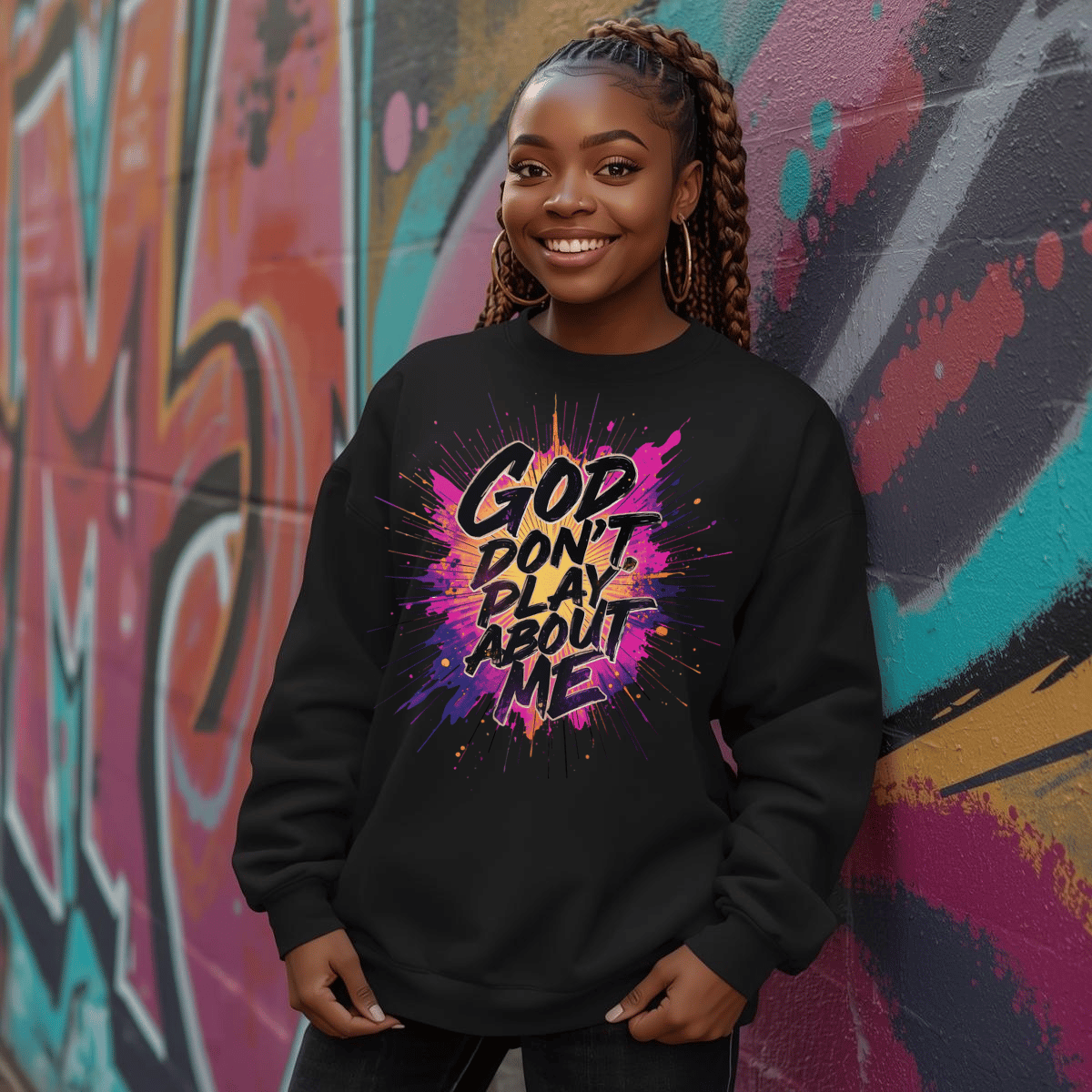 Bold lettering meets explosive color splashes for a powerful, faith-forward statement that turns heads and speaks confidence without saying another word.