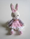 Della in a Dress is an amigurumi bunny rabbit that can sit up on her own. She has a ragdoll-style body with floppy arms and legs attached to the body, making her a great cuddle toy for kids, including babies, toddlers, and young children. Della’s outfit has a sweet and classic aesthetic with a frilly overalls dress, Peter Pan collar long-sleeve blouse, stockings, flats, and a cute bow. Della is very quick to work up using super bulky blanket yarn or chenille velvet yarn, and requires minimal sewing as the legs, body, and dress are all crocheted in one piece. She can be easily customized with different yarn colors, embellishments, appliques, and finishing touches. This stuffed animal plush is the perfect birthday, baby shower, and Christmas holiday gift!