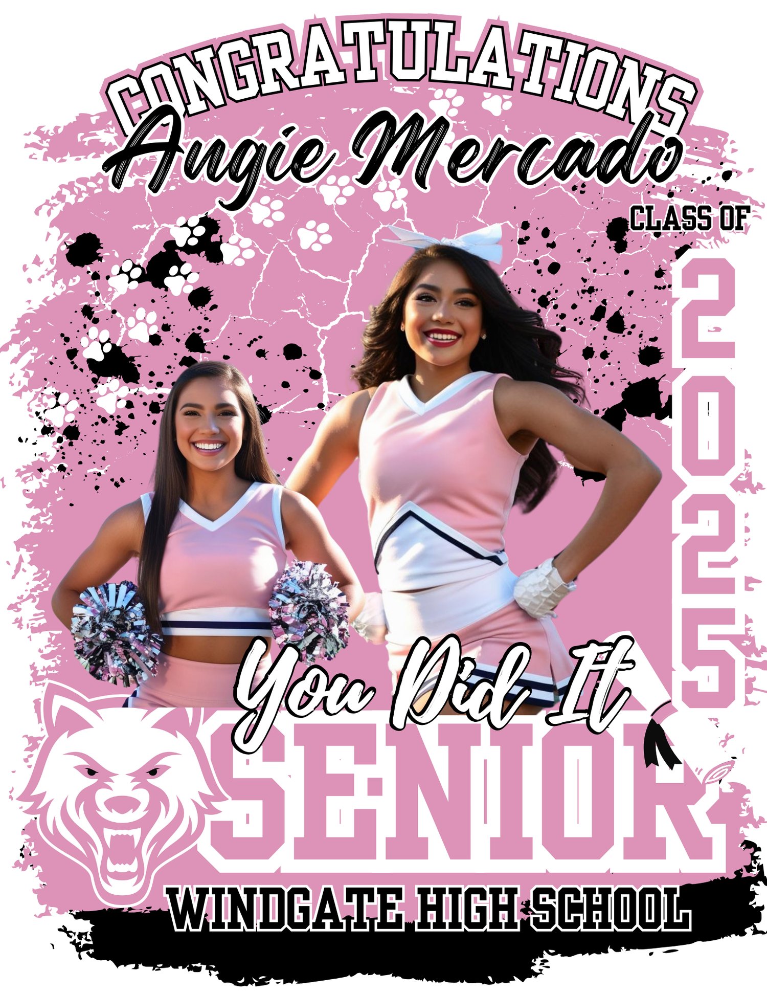 Celebrate the Class of 2025 with this cheer-inspired graduation design! Featuring a bold pink and black aesthetic, dynamic typography, and custom elements, this template is perfect for senior shirts, banners, posters, and digital announcements.