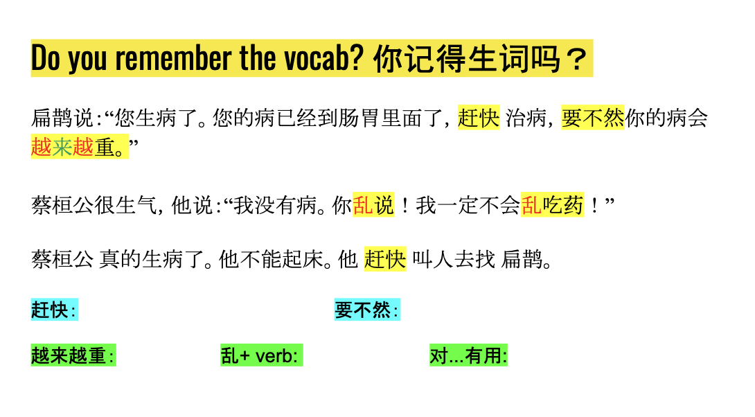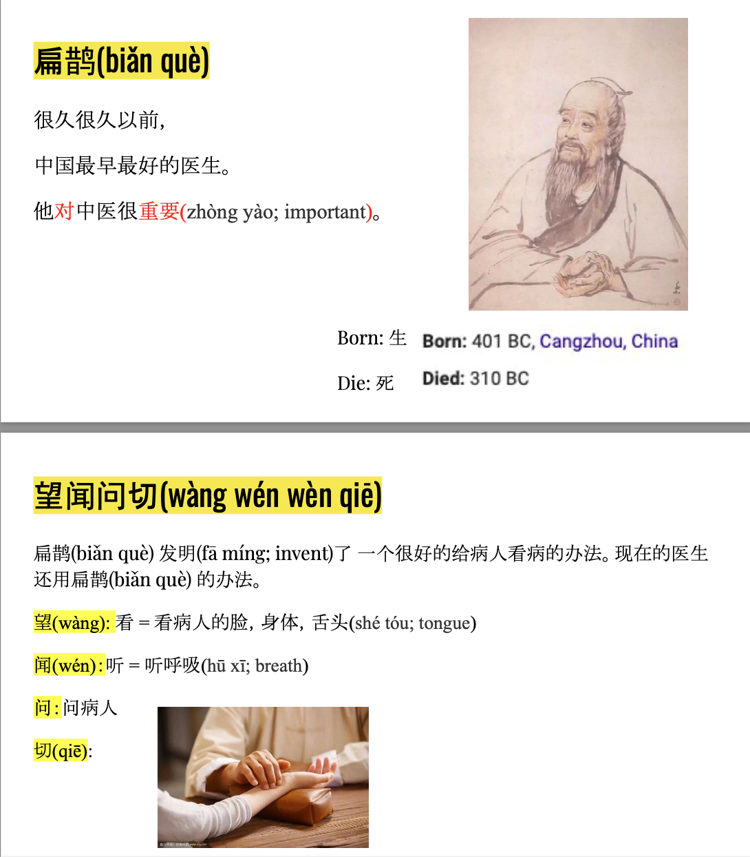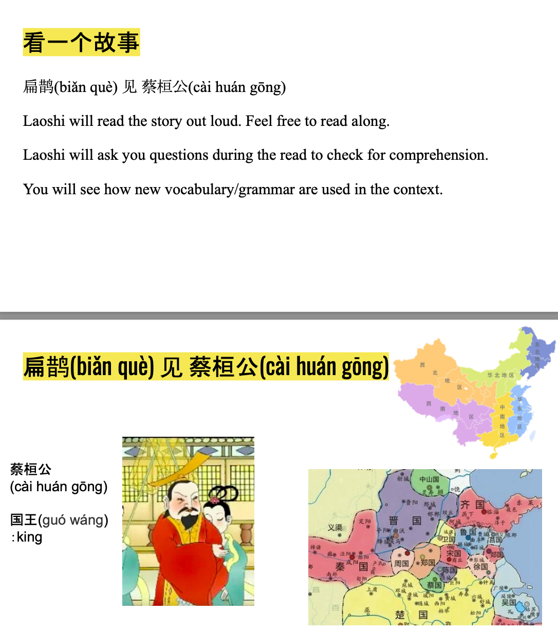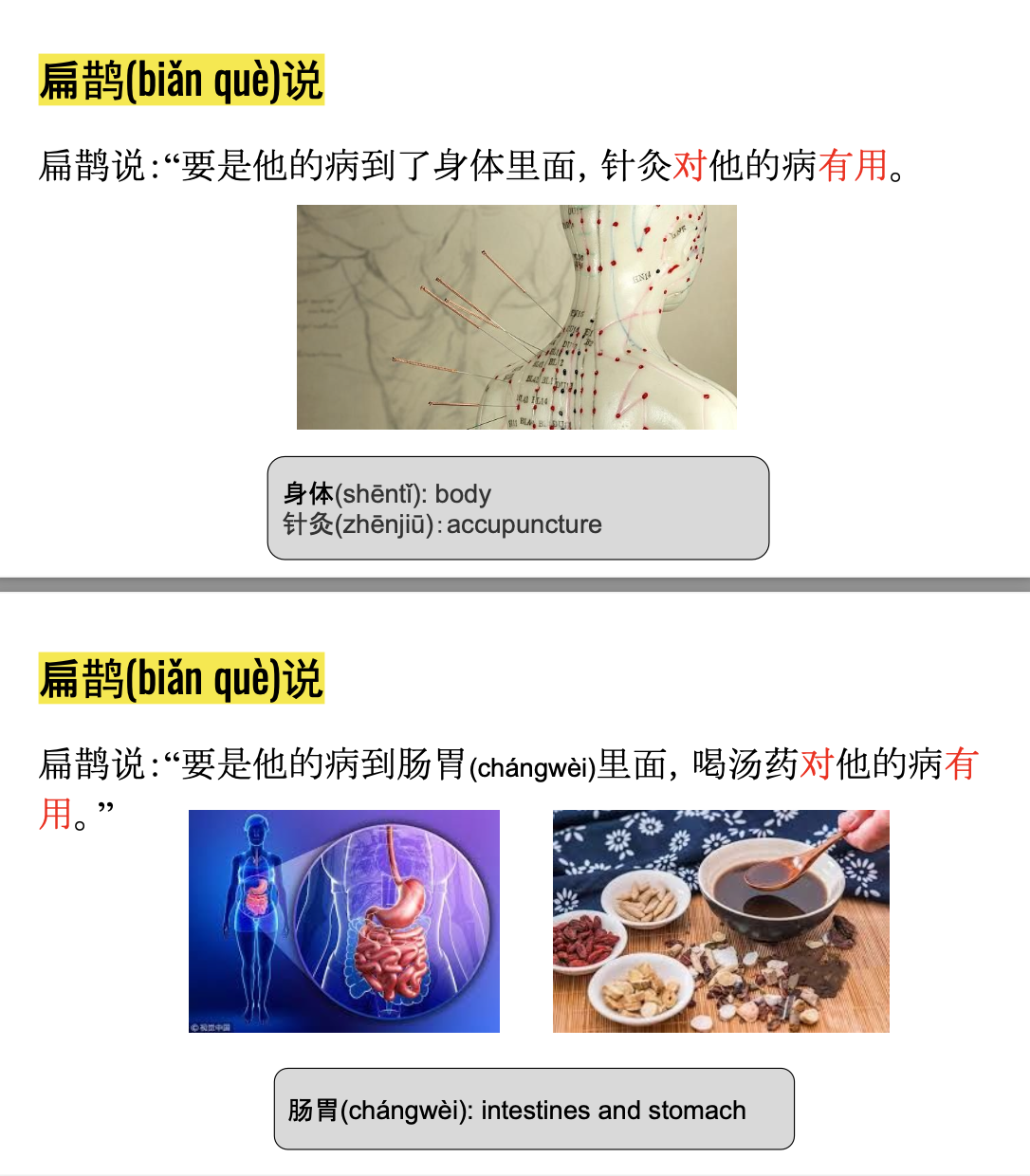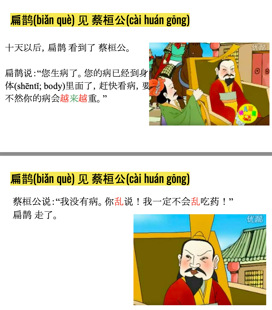 这个成语故事是根据Integrated Chinese Lesson 15 《看病》单元的一些重点生词编写的,生词在故事情境中重复出现,帮助学生有意义地输入语言,并且了解中医的文化。