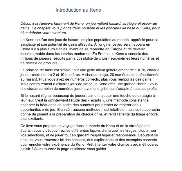 Ce livre vous propose un voyage dans le monde du Keno et de la stratégie des écarts : vous y découvrirez les différentes façons d'analyser les tirages, d'optimiser vos sélections, et de jouer tout en gardant l'esprit léger et responsable. Débutant ou habitué, vous trouverez ici des conseils, des explications et des exemples concrets pour enrichir votre expérience du Keno. Prêt à tenter votre chance avec méthode et plaisir ? Alors tournez la page et laissez-vous guider !