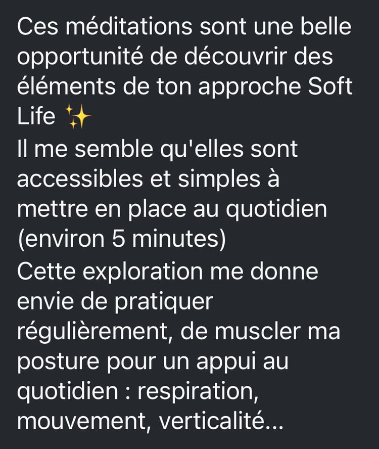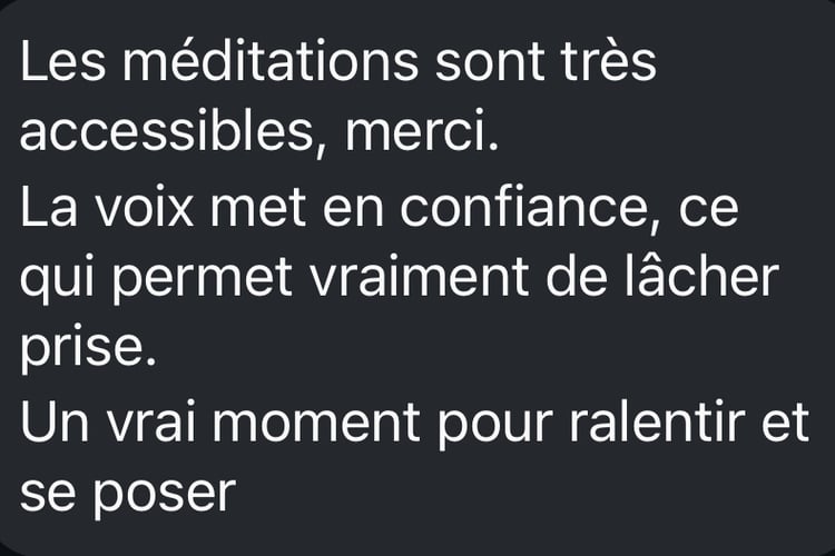 Dans ces méditations, tu ne cherches pas à “vider” ton esprit ou à “ne penser à rien”. Tu apprends à revenir à l’instant présent. À ton corps, ton souffle, tes sensations.