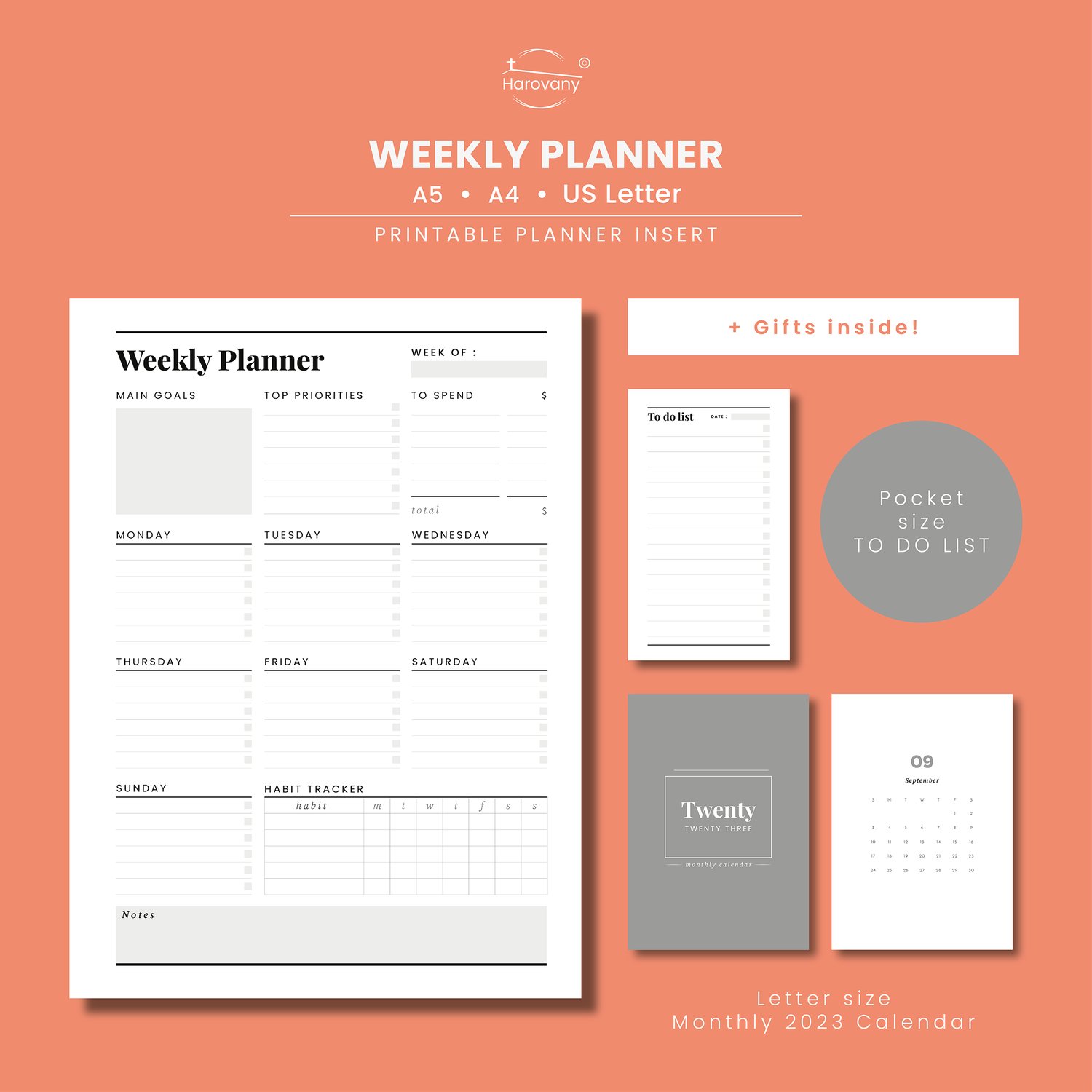 - Weekly planner: 3 PDF – A5, A4 and US Letter size