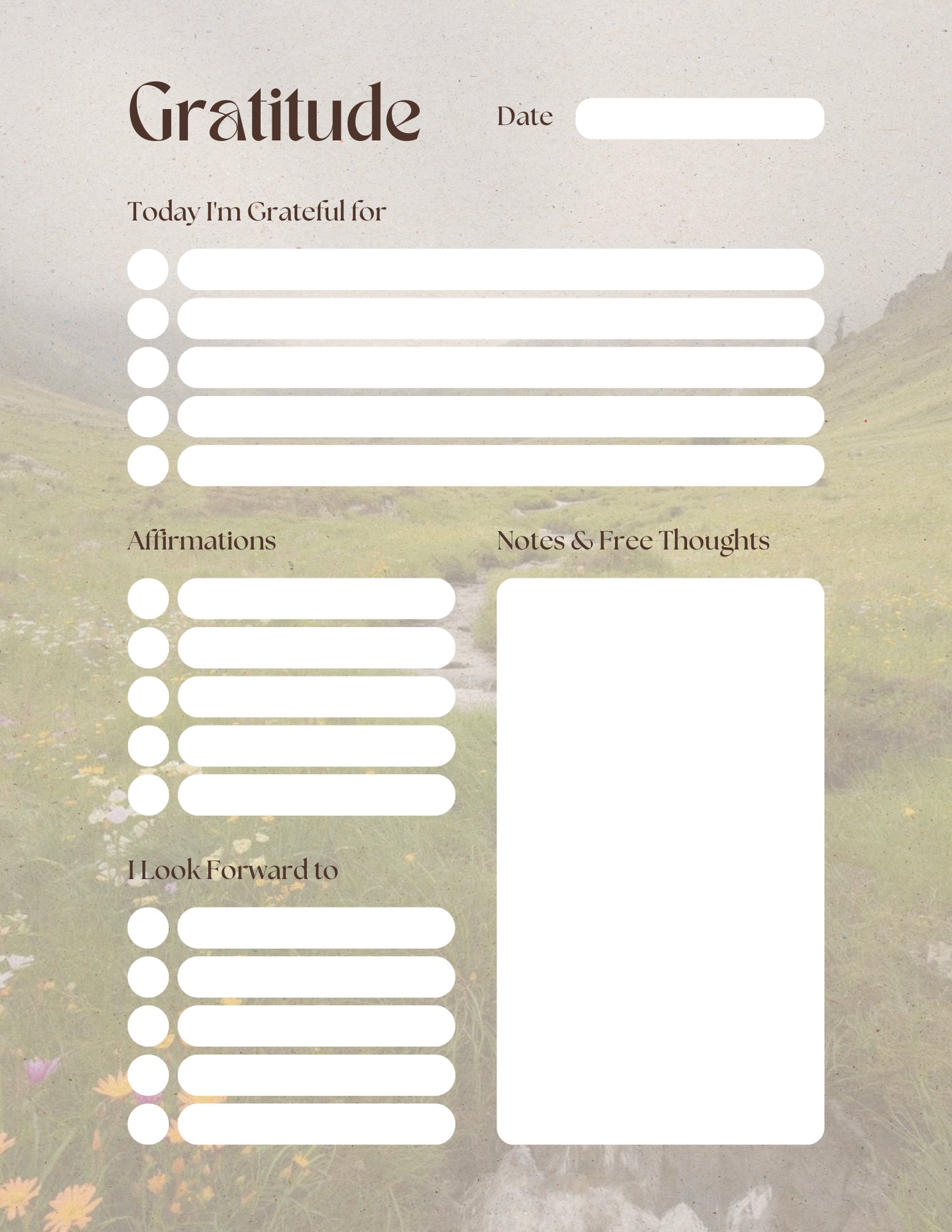 This March Gratitude & Reflection Journal Insert is thoughtfully designed to support daily mindfulness and emotional clarity. With dedicated sections for gratitude, affirmations, forward-looking intentions, and free writing, this page helps you process your thoughts while grounding yourself in the present moment.
