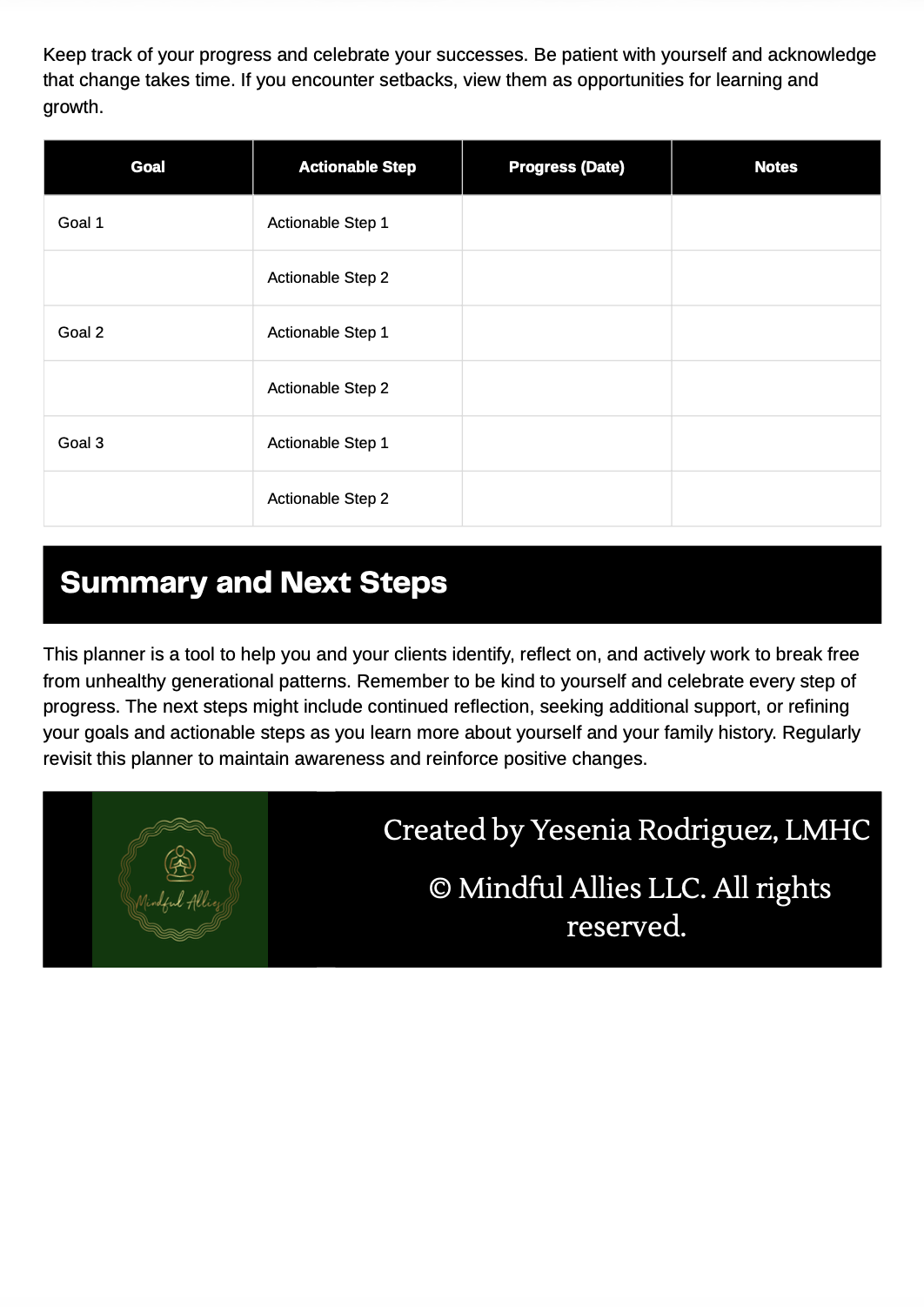 A reflective section that encourages clients to consolidate insights and identify ongoing steps toward sustainable change.