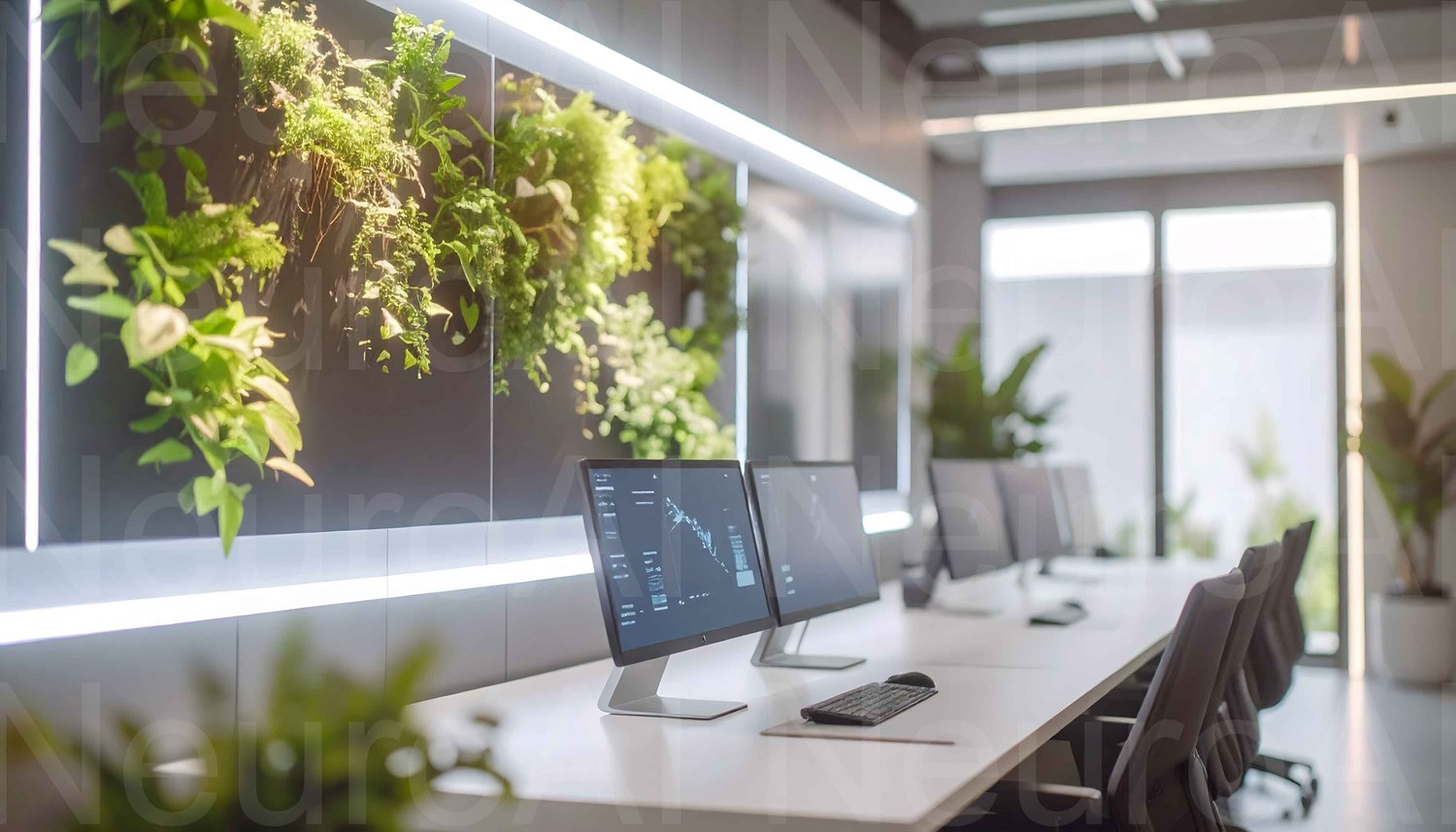 Discover a contemporary office sanctuary where lush living walls infuse a vibrant, natural atmosphere into a high-tech workspace. This serene environment promotes focus and creativity, ideal for dynamic business teams seeking innovation and well-being. Imagine productive meetings and inspired work sessions amidst calming greenery and cutting-edge technology.
