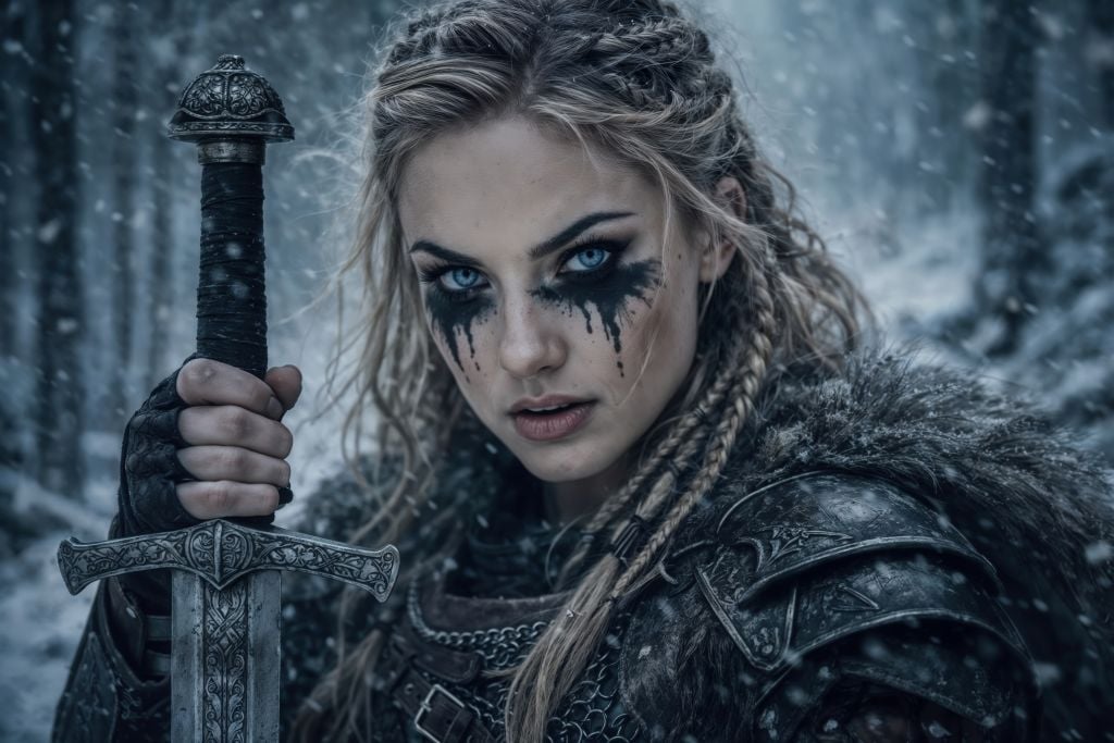 Eyes of the Northwind is a striking 9K high-resolution artwork that captures a warrior at the edge of legend—steel in hand, snow in the air, and defiance burning behind ice-blue eyes. The stark contrast of frost and shadow, the intricate engravings on the blade, and the raw intensity of her war-marked gaze create an image that feels alive with tension and resolve.