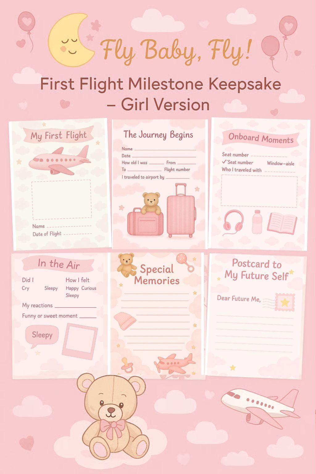 Capture the magic of your baby girlβs first flight with this adorable printable memory keepsake! From takeoff giggles to window views and in-flight naps, this keepsake is the perfect way to preserve a milestone your family will always remember.