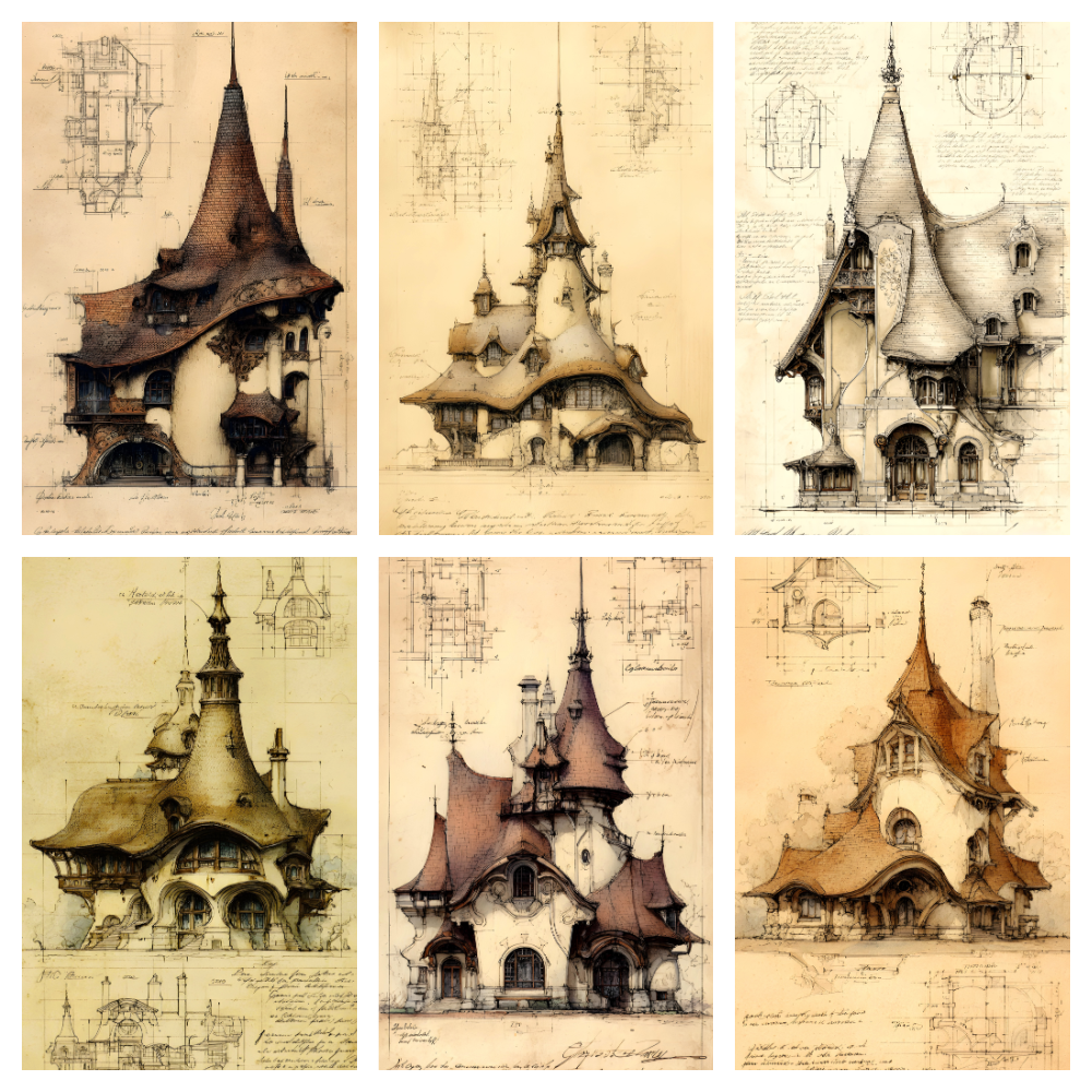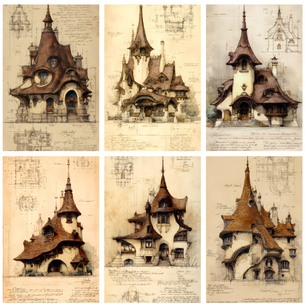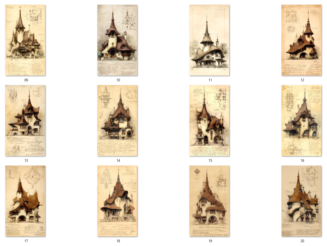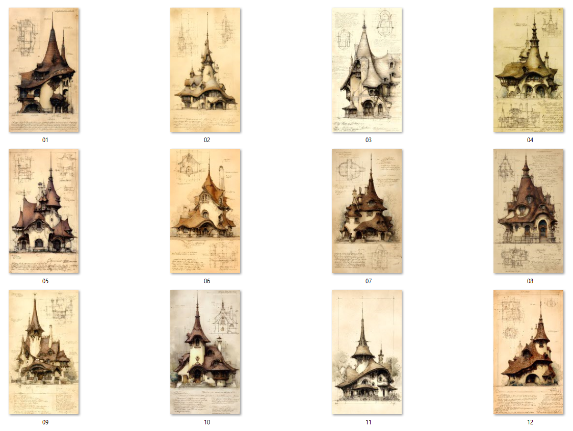 20 AI-generated digital JPG art prints – Fantasy Architecture collection, Sepia Epic Storybook Fantasy Architecture - 20 Art Prints. Gothic building illustration, architectural sketch, vintage blueprint art, digital download, wall art, fantasy castle, art nouveau building, steampunk architecture, whimsical house, instant download, printable wall art. High resolution 300 DPI, 2700x4800 pixels, vertical format 9:16, ready for print or digital use. Instant download, no physical product. Commercial license included.