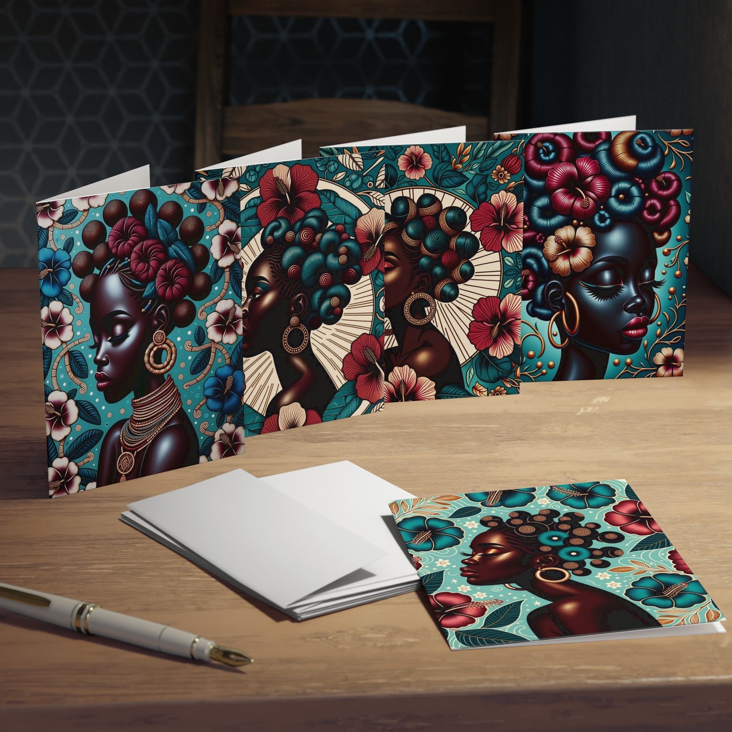 Presenting the "African Hibiscus" collection, a set of five distinct 5x7 high-resolution greeting card designs. Each artwork elegantly showcases a beautiful Black Queen, symbolizing strength and grace, surrounded by the radiant beauty of African hibiscus flowers. These designs not only capture the essence of African culture but also highlight the regal beauty of the Black Queen.