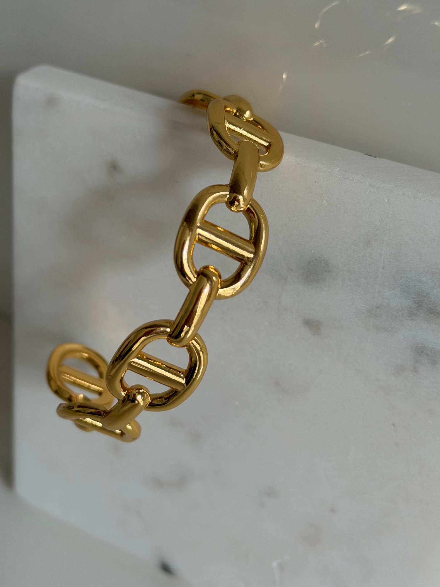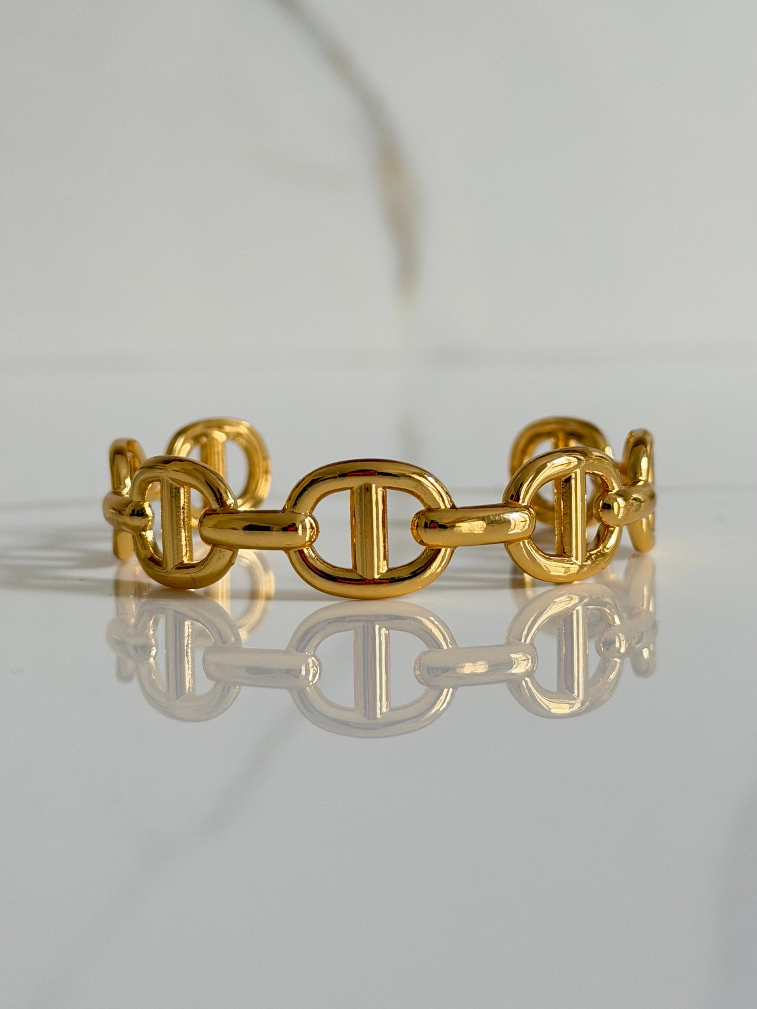Un bracelet structuré aux maillons ovales ajourés, pensé comme une pièce forte.