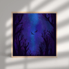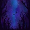 Under a Shared Sky depicts two birds flying side by side beneath a vast, galaxy-like night, where stars shimmer softly against deep blues and purples. Though the forest below stands bare and still, its leafless trees reaching upward in silence, the sky above feels alive with quiet wonder. The contrast between the lifeless ground and the luminous heavens creates a sense of comfort, as if companionship and beauty persist even in emptiness. United in flight, the birds become a gentle reminder that connection endures, carried beneath the same sky that watches over all.