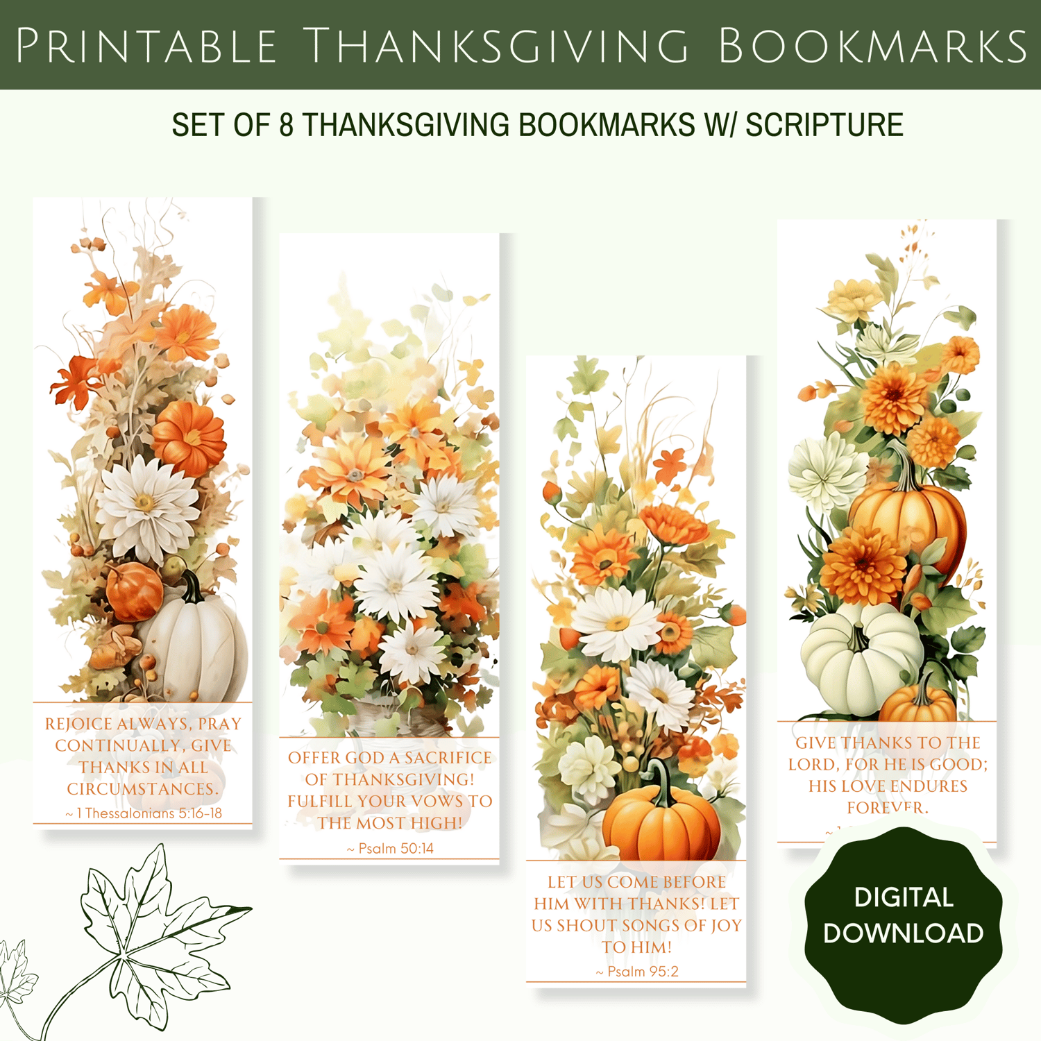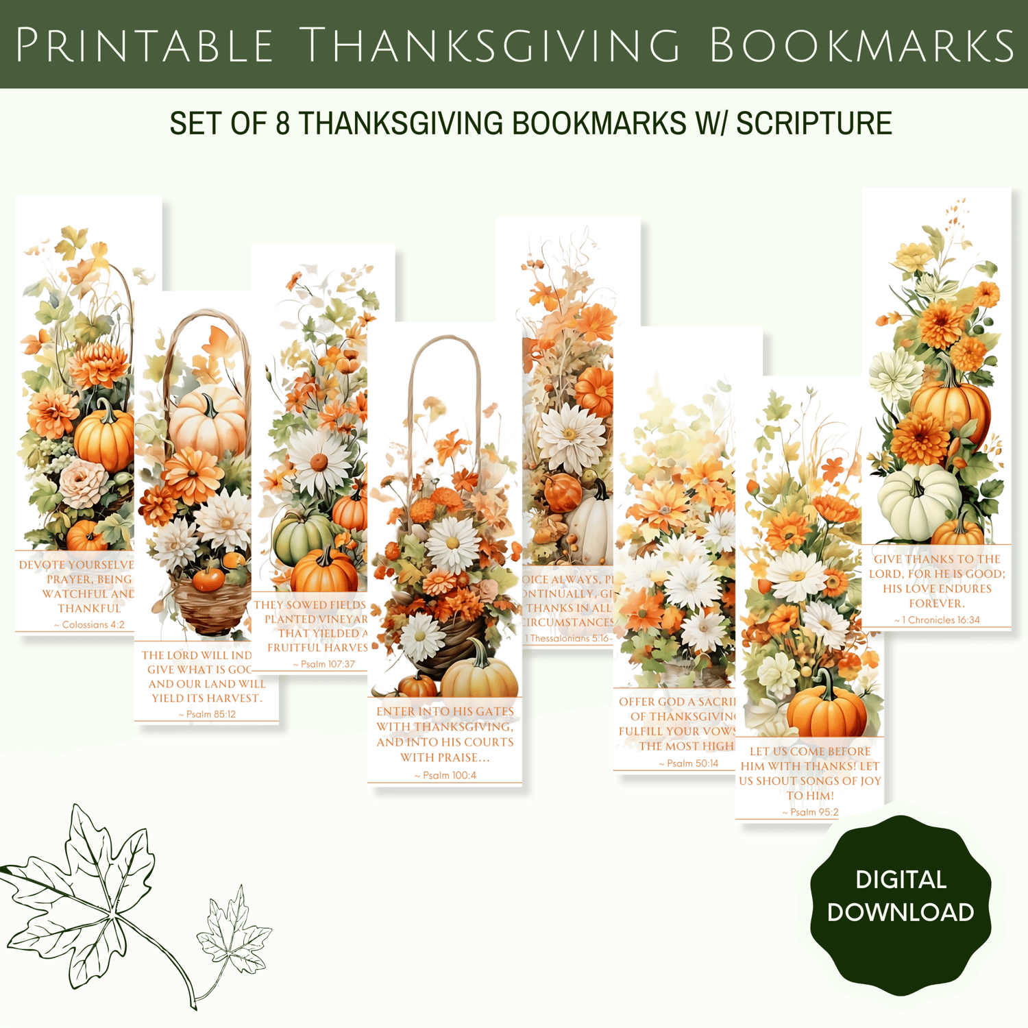 This fall-themed, printable bible verse bookmark set features 8 instant downloadable bookmarks that you can print at home. These lovely bookmarks feature popular, inspirational Thanksgiving scriptures are perfect for any book lover or to gift any bool lover.