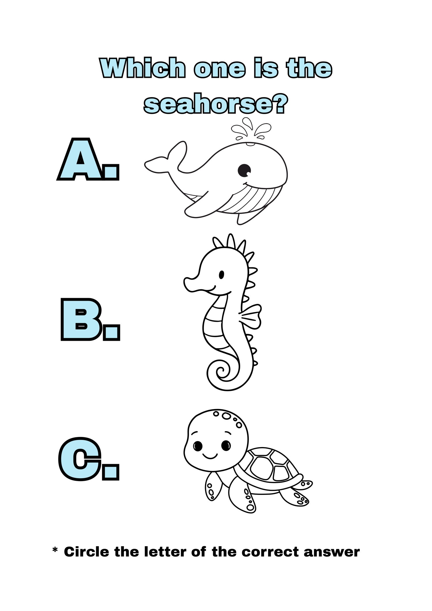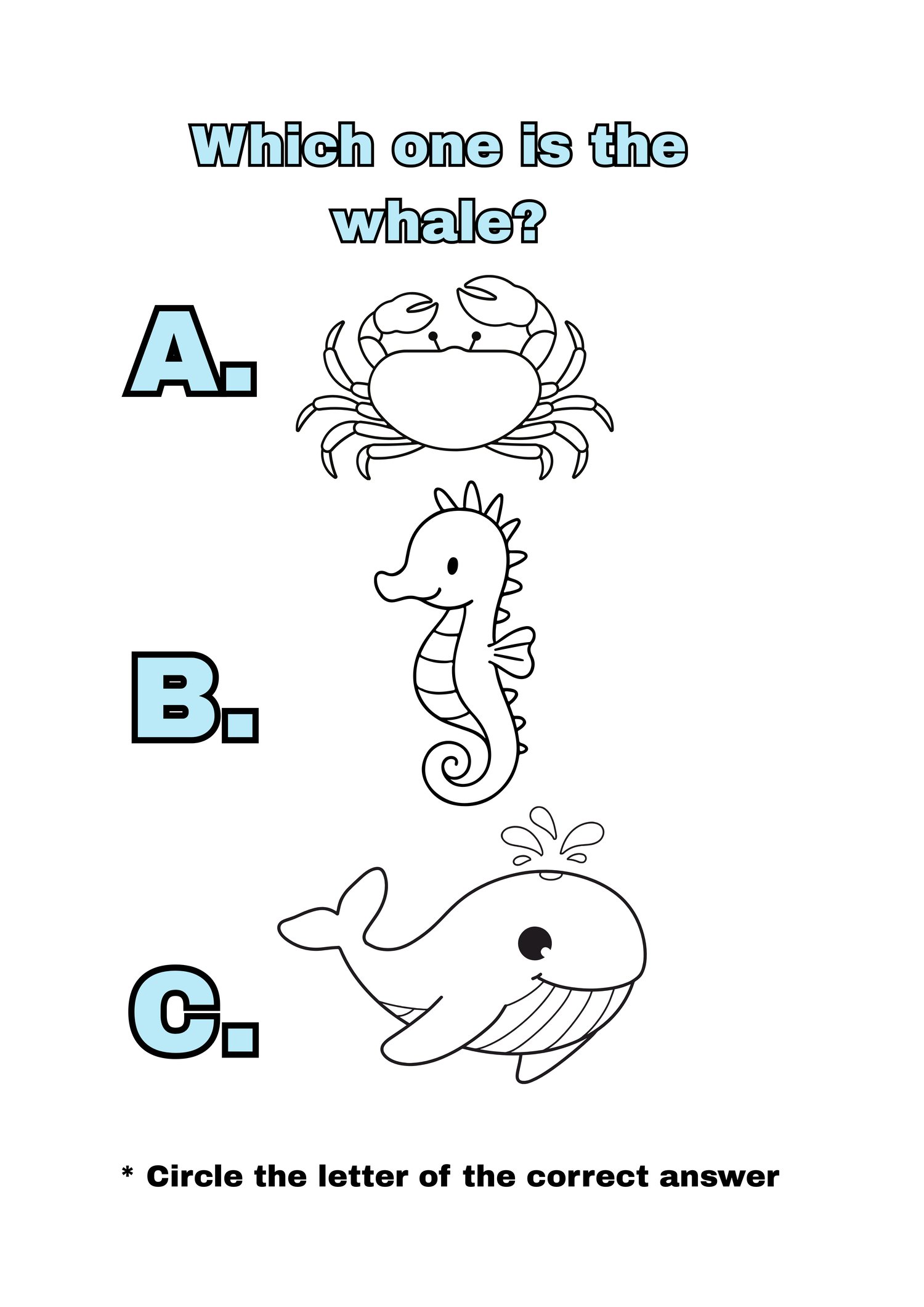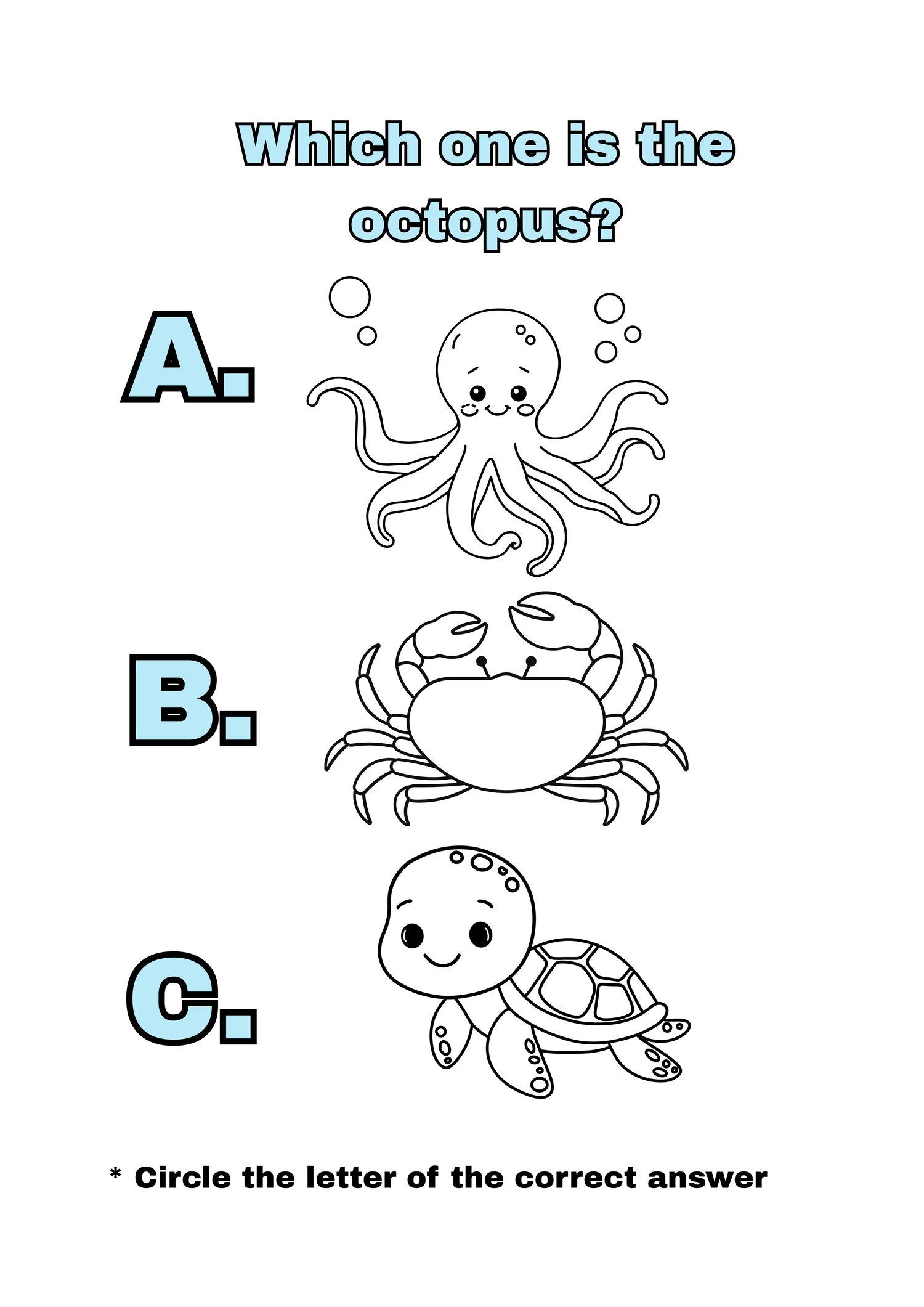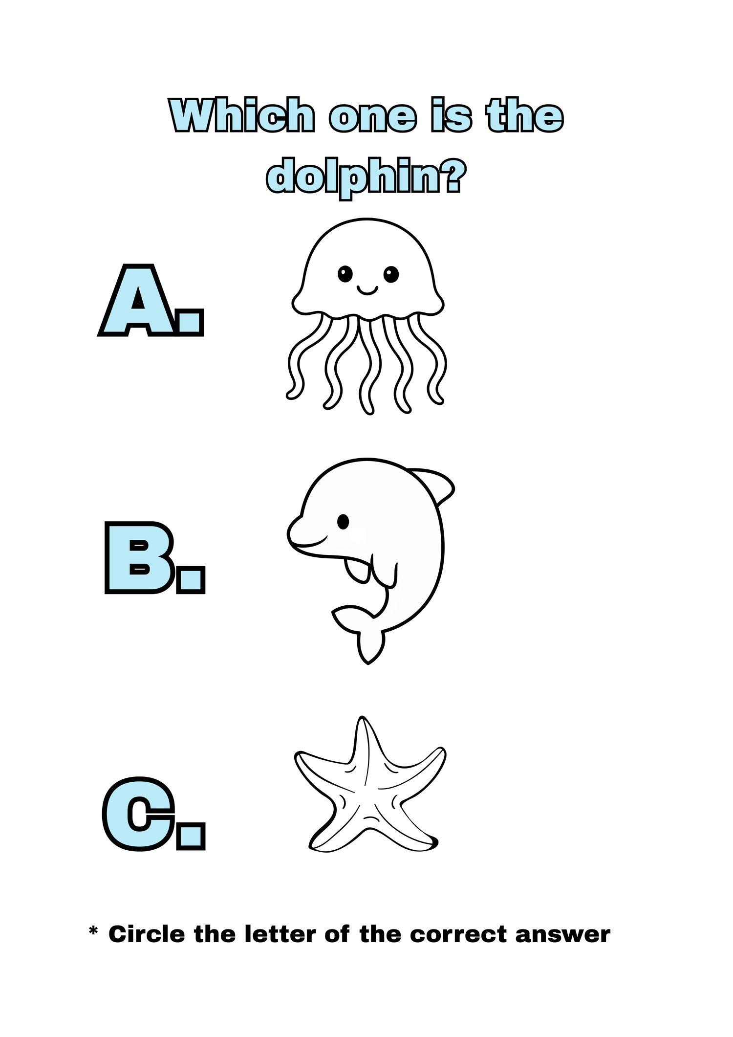 Children will practice identifying ocean animals, observing visual details, and choosing the correct answer—perfect for preschool and early elementary learners.