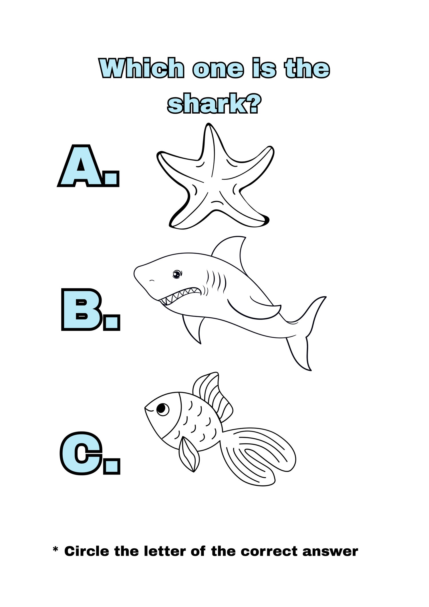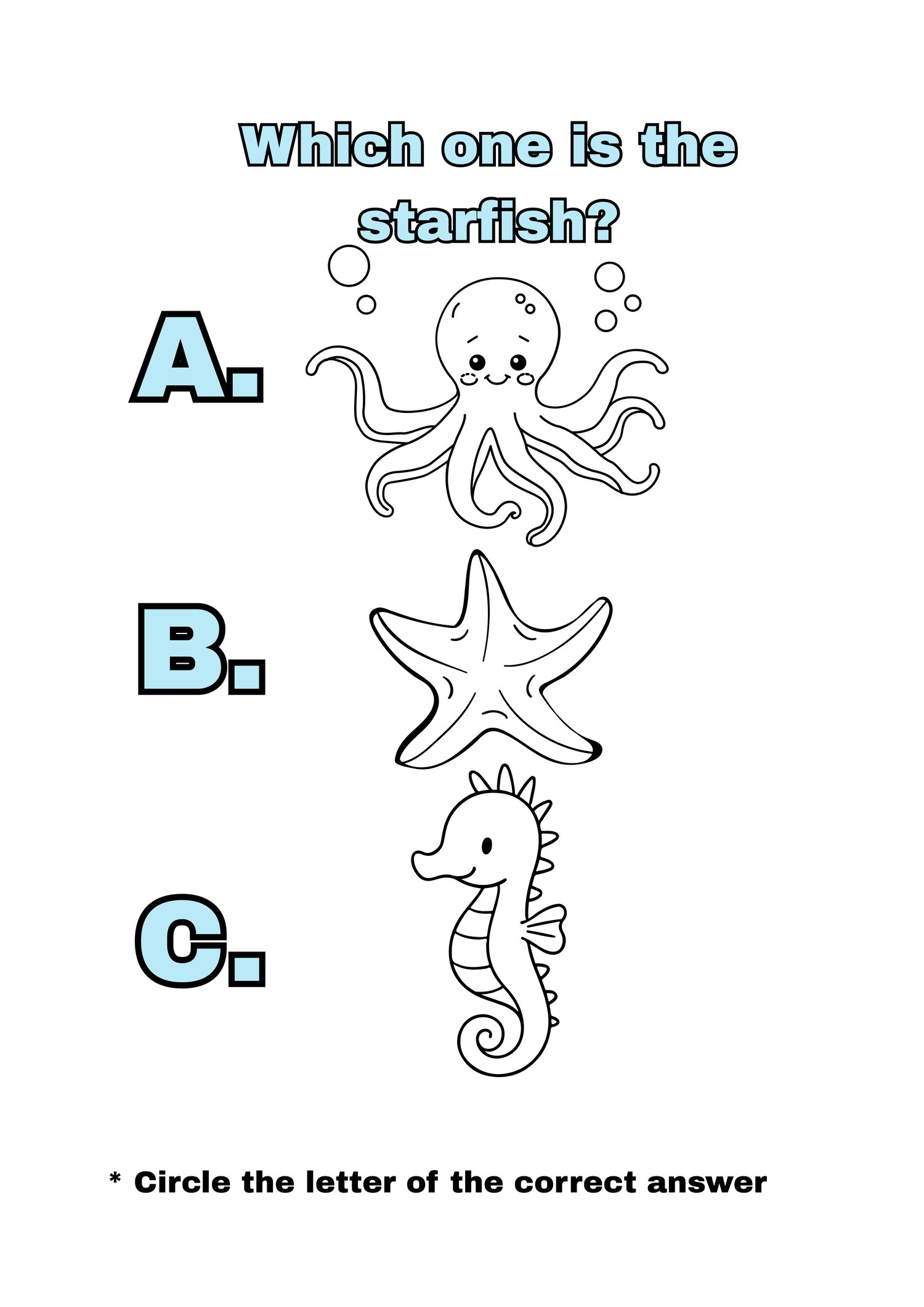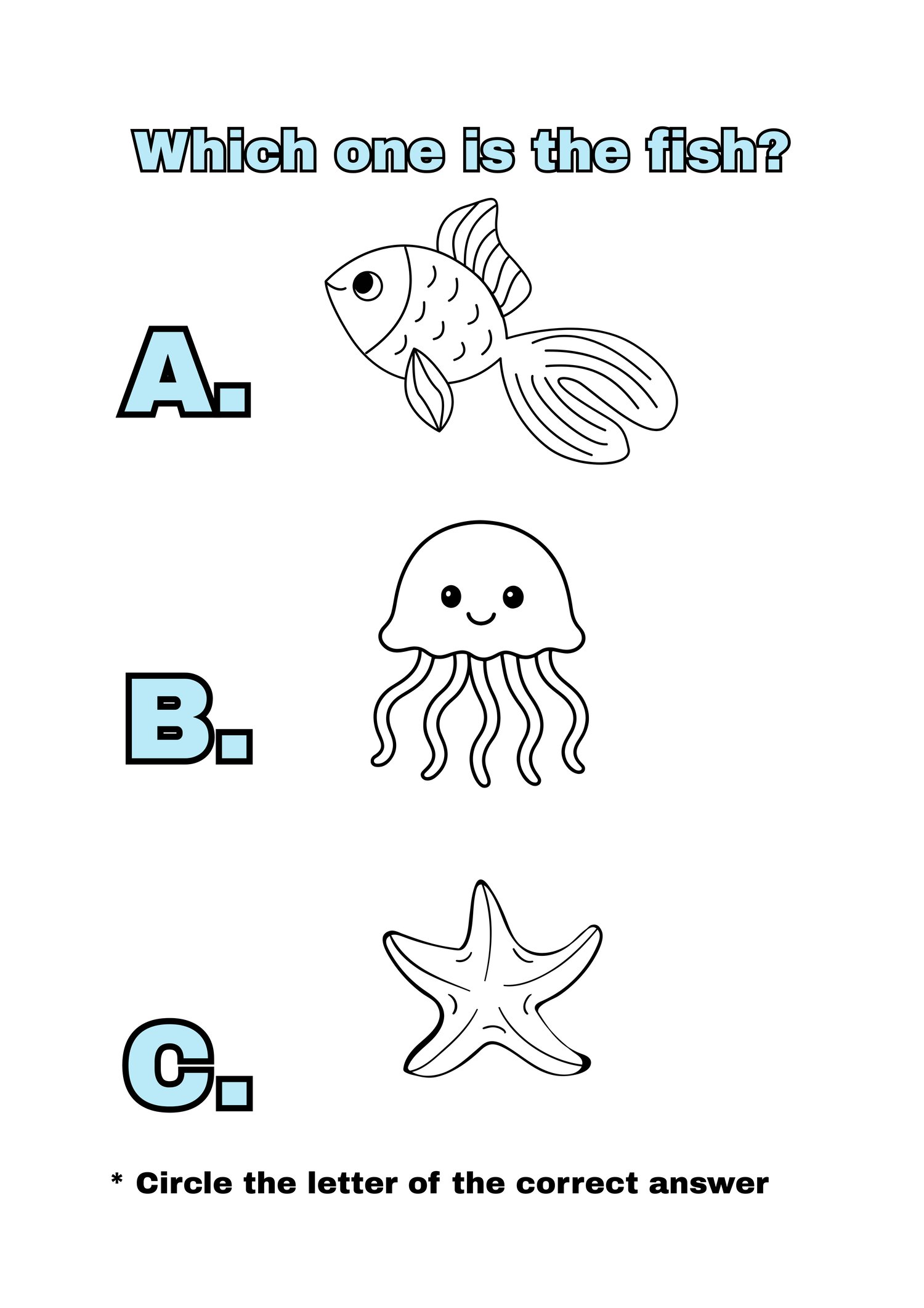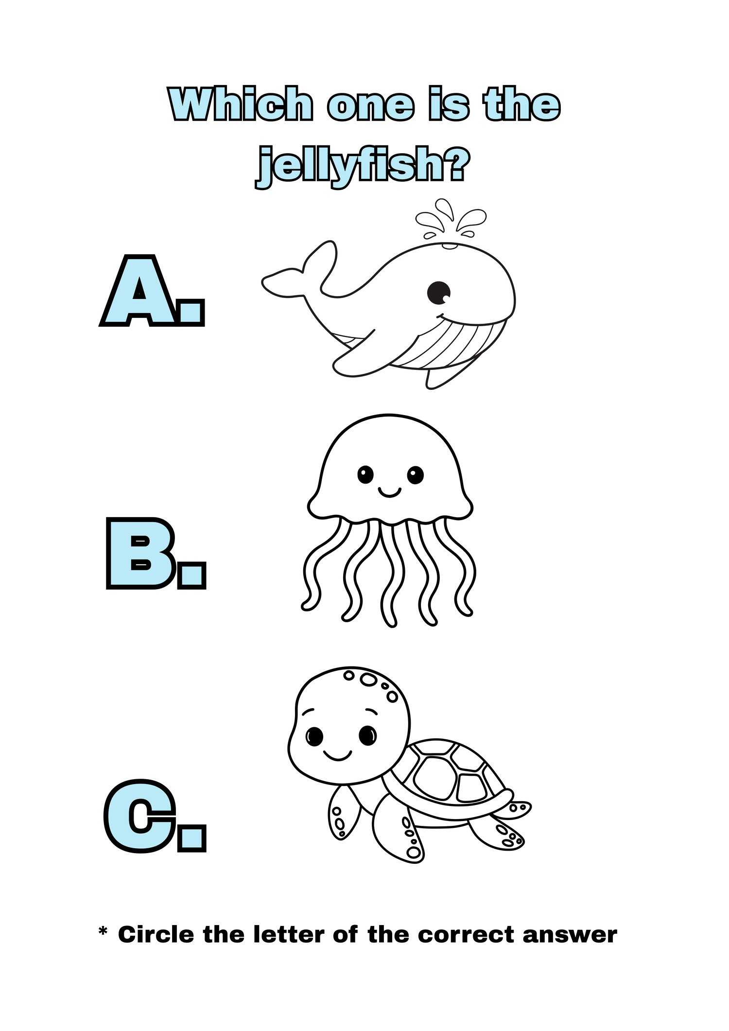 Children will practice identifying ocean animals, observing visual details, and choosing the correct answer—perfect for preschool and early elementary learners.
