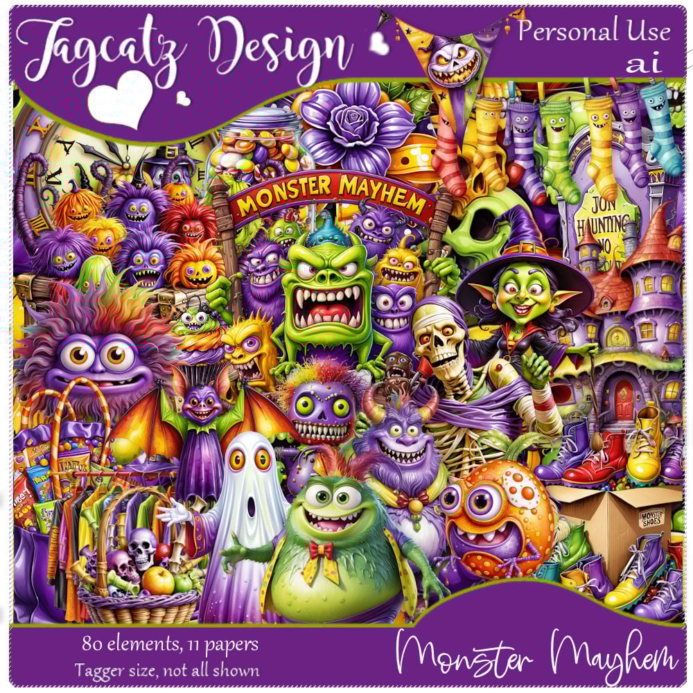 The cutest monsters ever are creating Halloween mayhem again! 80 elements and 11 matching papers. AI kit. Tagger size. Not all shown. Personal use only.