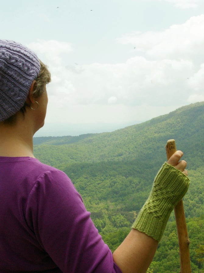 The Shenandoah National Park, through which Skyline Drive snakes, is very close to my home in the mountains of Virginia. At all times of year we like to go up in the Park for quick hikes with the dog and kids. The twisting stitches at the wrist of these mitts remind me of the passes – gaps – through the mountains, and particularly of Swift Run Gap, which has wonderfully fractured rock faces and rivulets of water everywhere in the spring after it rains.