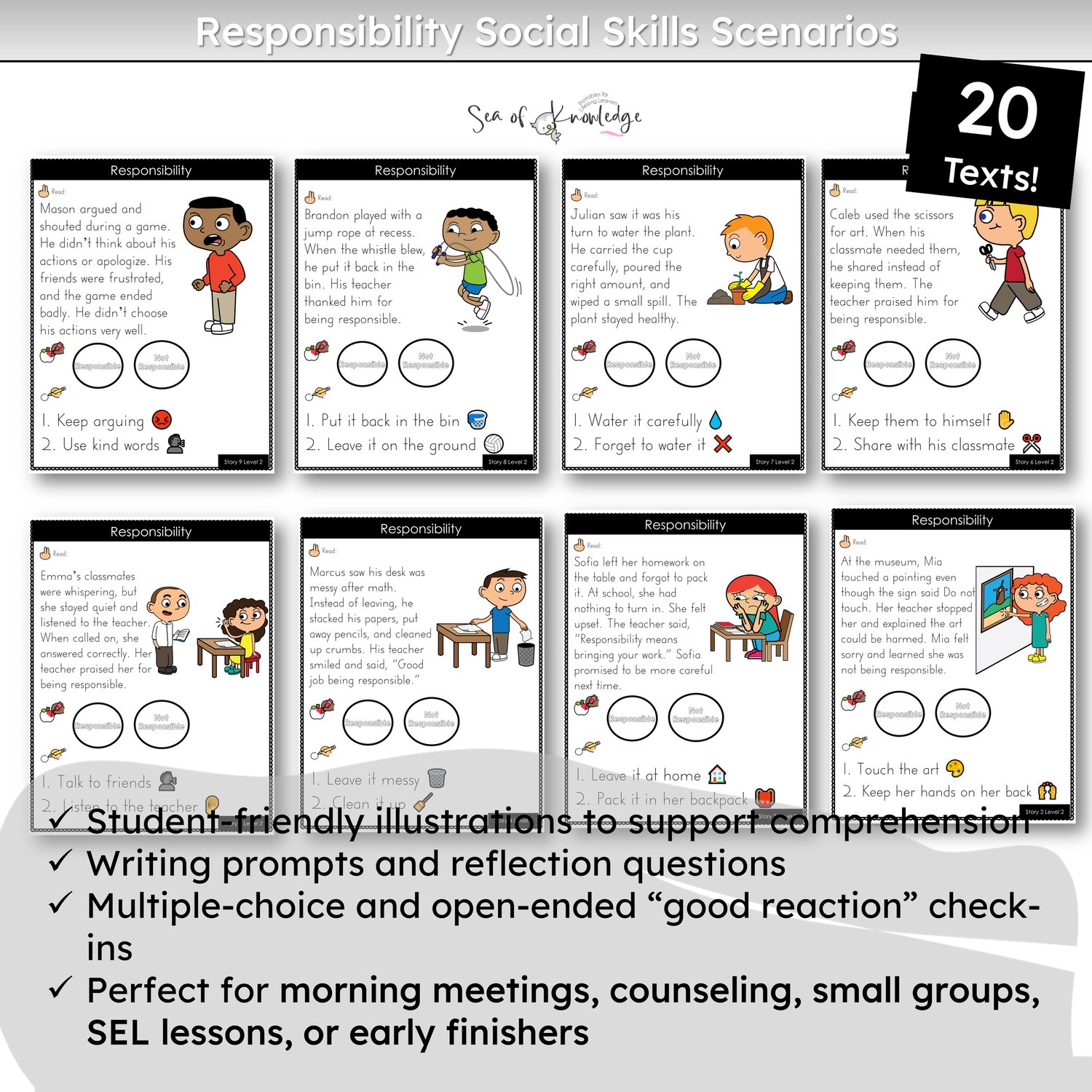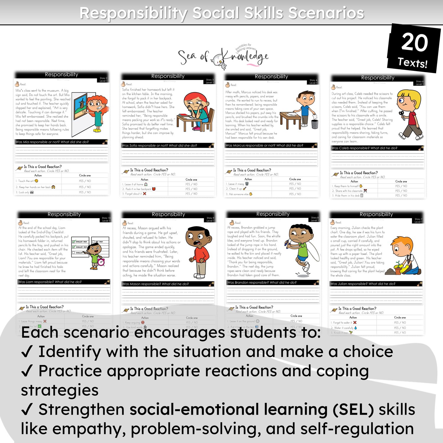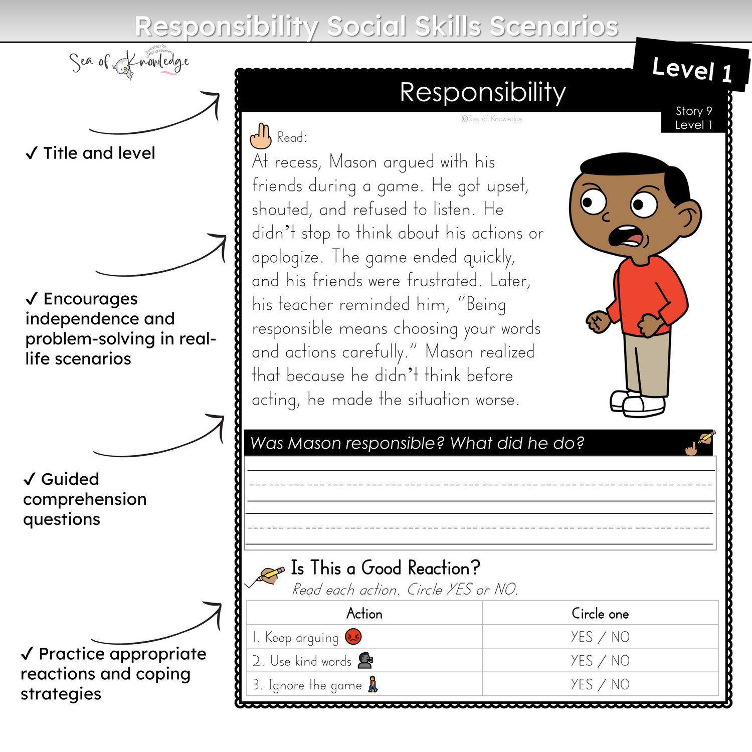 This resource is ideal for responsibility social skills worksheets, SEL lessons for kids, social emotional learning activities, responsibility scenarios for students, classroom management worksheets, social skills stories for kids, decision-making SEL activities, behavior management tools, self-regulation worksheets, and social emotional story activities.