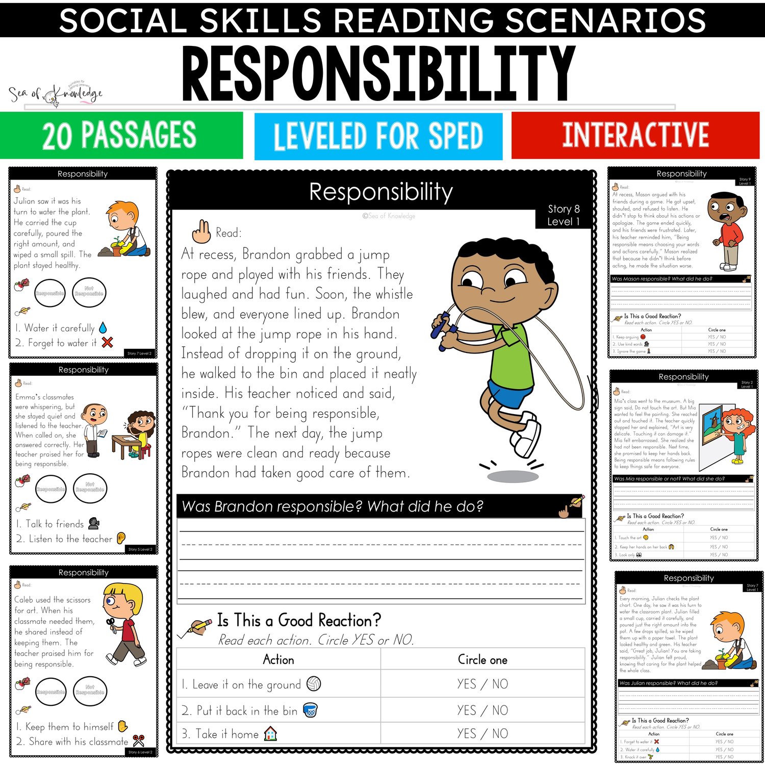 teaching responsibility worksheets, social responsibility activities, leveled social skills stories, printable SEL resources, responsibility social stories elementary, character education lessons, accountability worksheets for kids, social emotional regulation worksheets, small group SEL activities, responsibility SEL lessons.