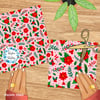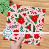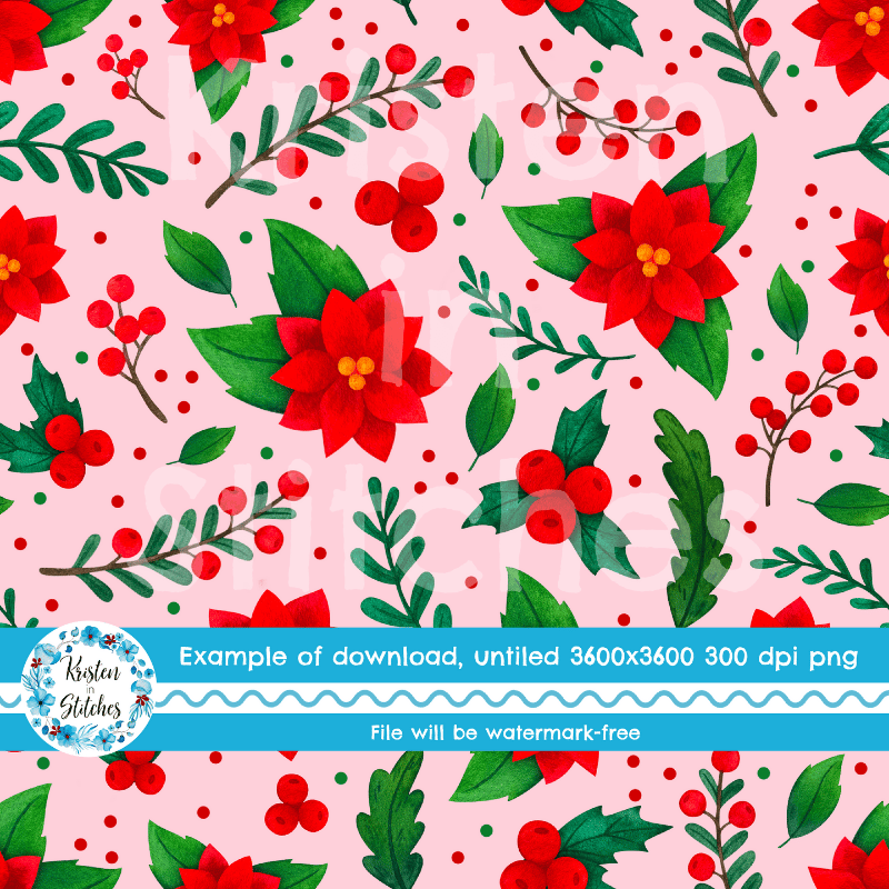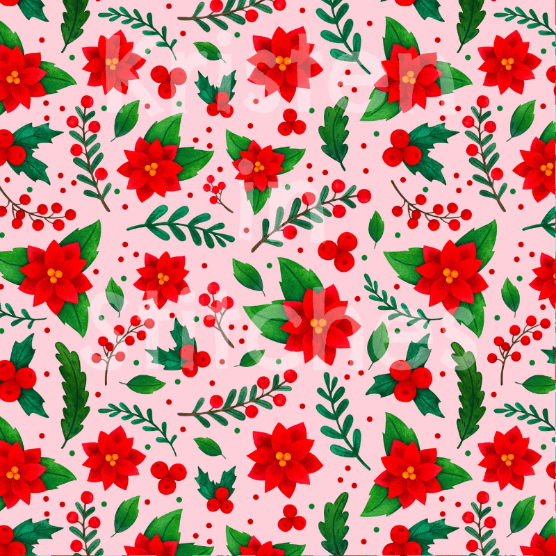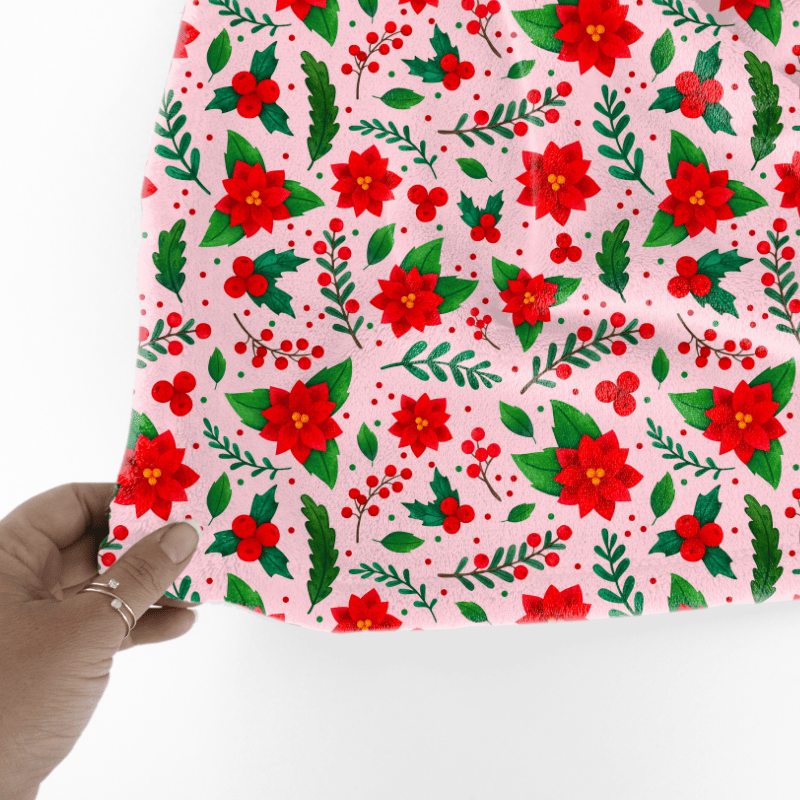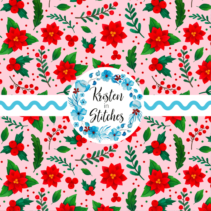 Pretty red poinsettia flowers, holly and berries and winter greenery on pink.