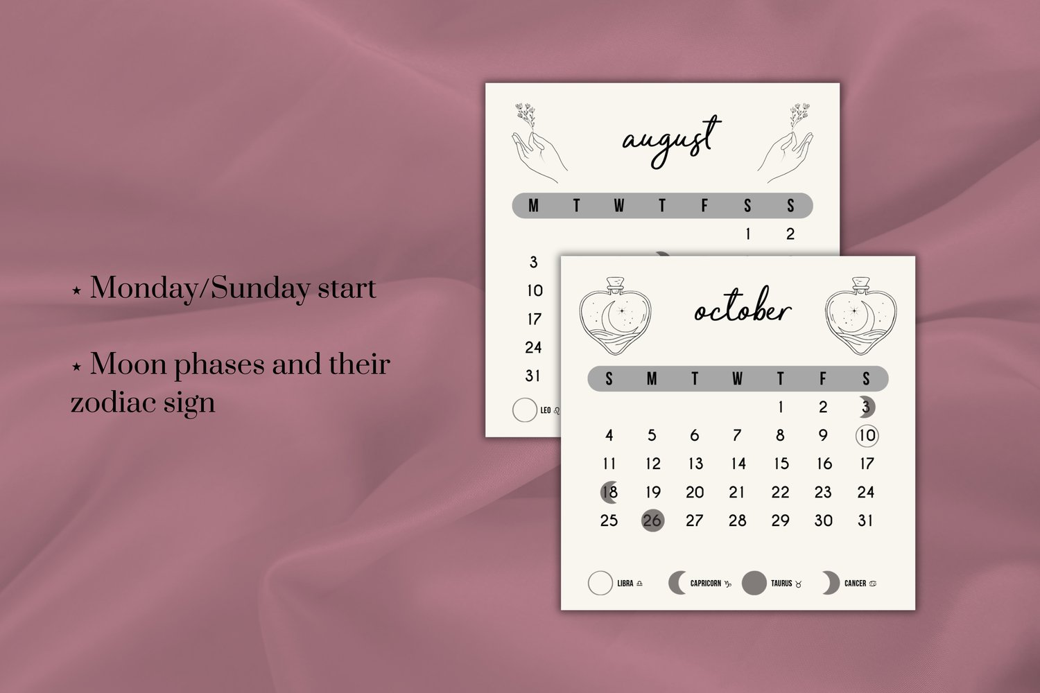 As this is a digital download, no physical product will be mailed to you. You'll receive one ZIP file containing the 2026 calendar with a folder containing the stand template in 2 different sizes: A4 (21x29.7 cm/8.3x11.7 in) and Letter US (21.6x27.9 cm/8.5x11 in). On the second folder, you’ll find the calendar in A4 and Letter, each with a Monday or Sunday start option (for each size of the calendar).