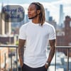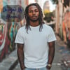 This free mockup set includes 4 high-resolution JPEGs featuring a stylish male model with locs, posing in various outdoor urban settings with graffiti and cityscape backgrounds. These mockups are ideal for giving your shirt designs an authentic, edgy feel for social media, Etsy, or product previews.