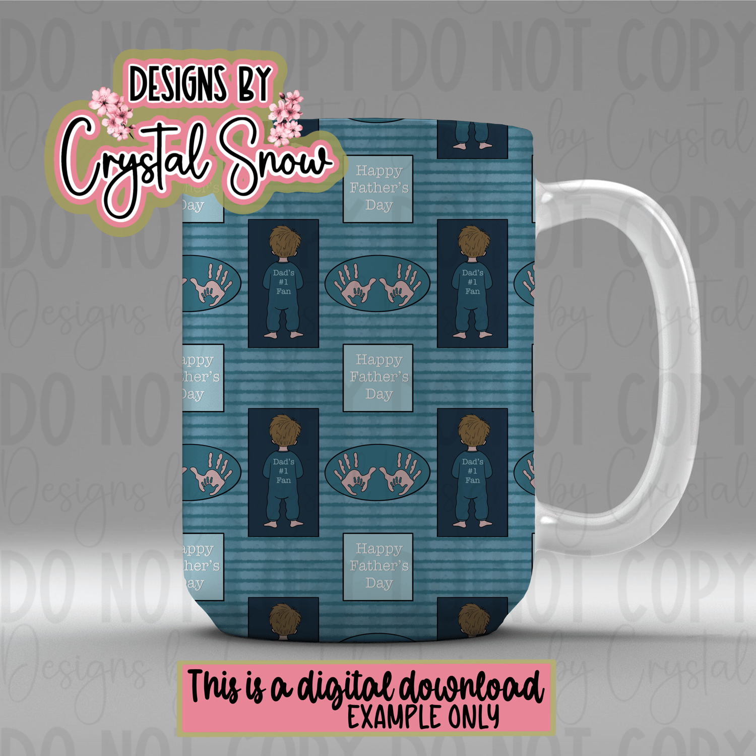 Celebrate Father’s Day with this touching hand-drawn seamless tile featuring a young boy standing with his back to the viewer in a cozy “Dad’s #1 Fan” pajama onesie. Surrounded by soft handprints and Father’s Day messages, this pattern is perfect for creating personalized gifts, cards, sublimation crafts, and custom keepsakes.