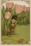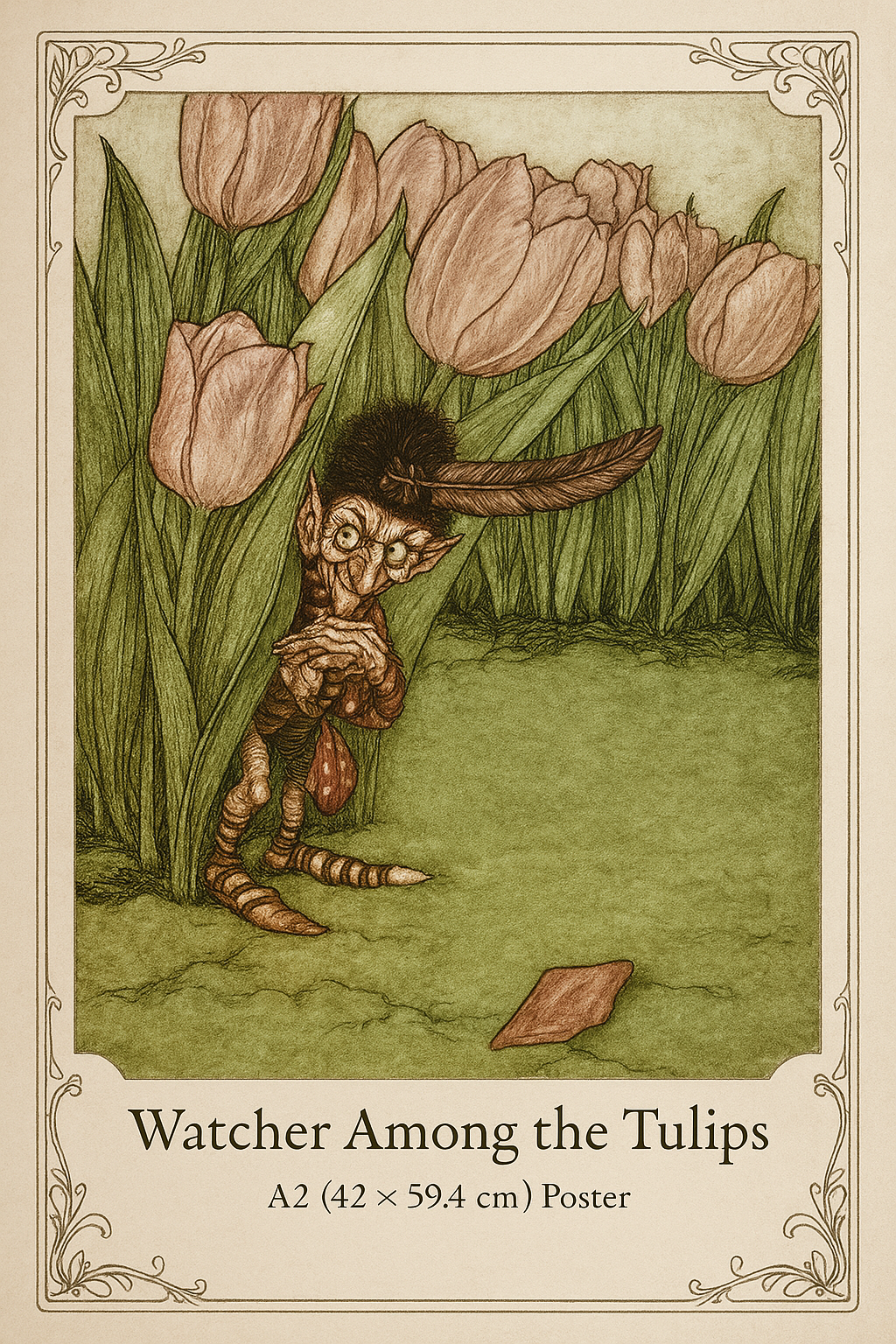 Step into the whimsical side of the Secret Garden with Watcher Among the Tulips, a detailed watercolor illustration inspired by the mischievous world of Peter Pan. A quirky woodland creature hides among oversized tulips, watching the world unfold with wide eyes and a mysterious grin.