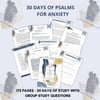 A printable/digital Bible study, and prayer journal/workbook. It is 172 pages long! 30 encouraging Psalms for anxiety-free living. Learn from David and other Psalmists how they coped with extreme anxiety, yet knew the supernatural peace that can only come from God.