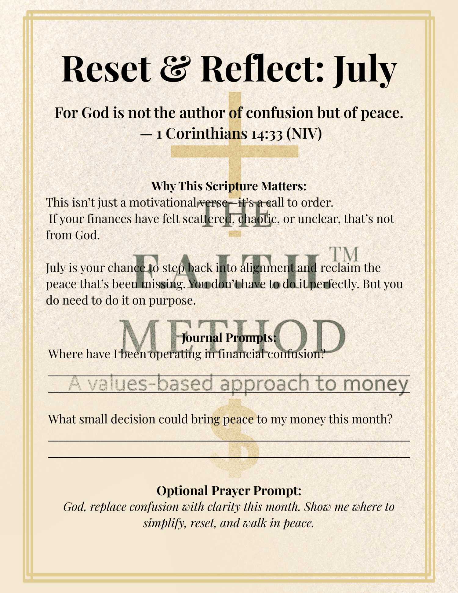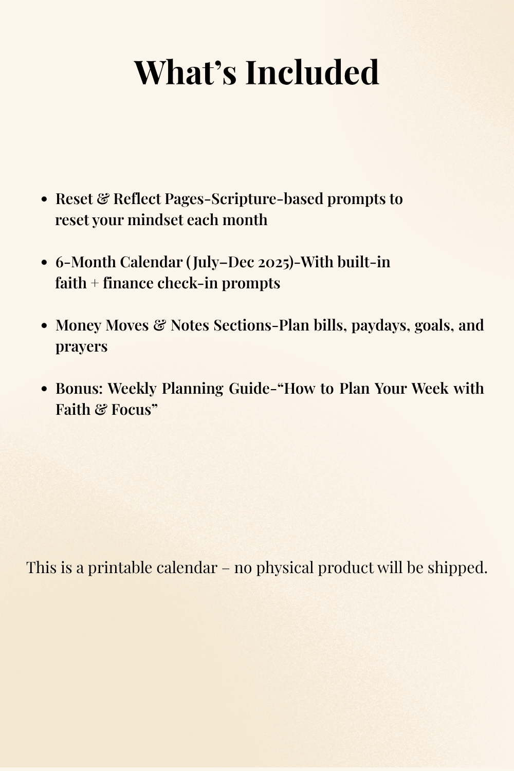 - ✨ Monthly Money Calendar – Dated from July to December 2025 with built-in prompts for faith + finance check-ins.