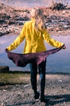Piewhacket is constructed from three sequential short row triangles which build on each other, with a final uneven edging knit from live stitches using additional short rows.