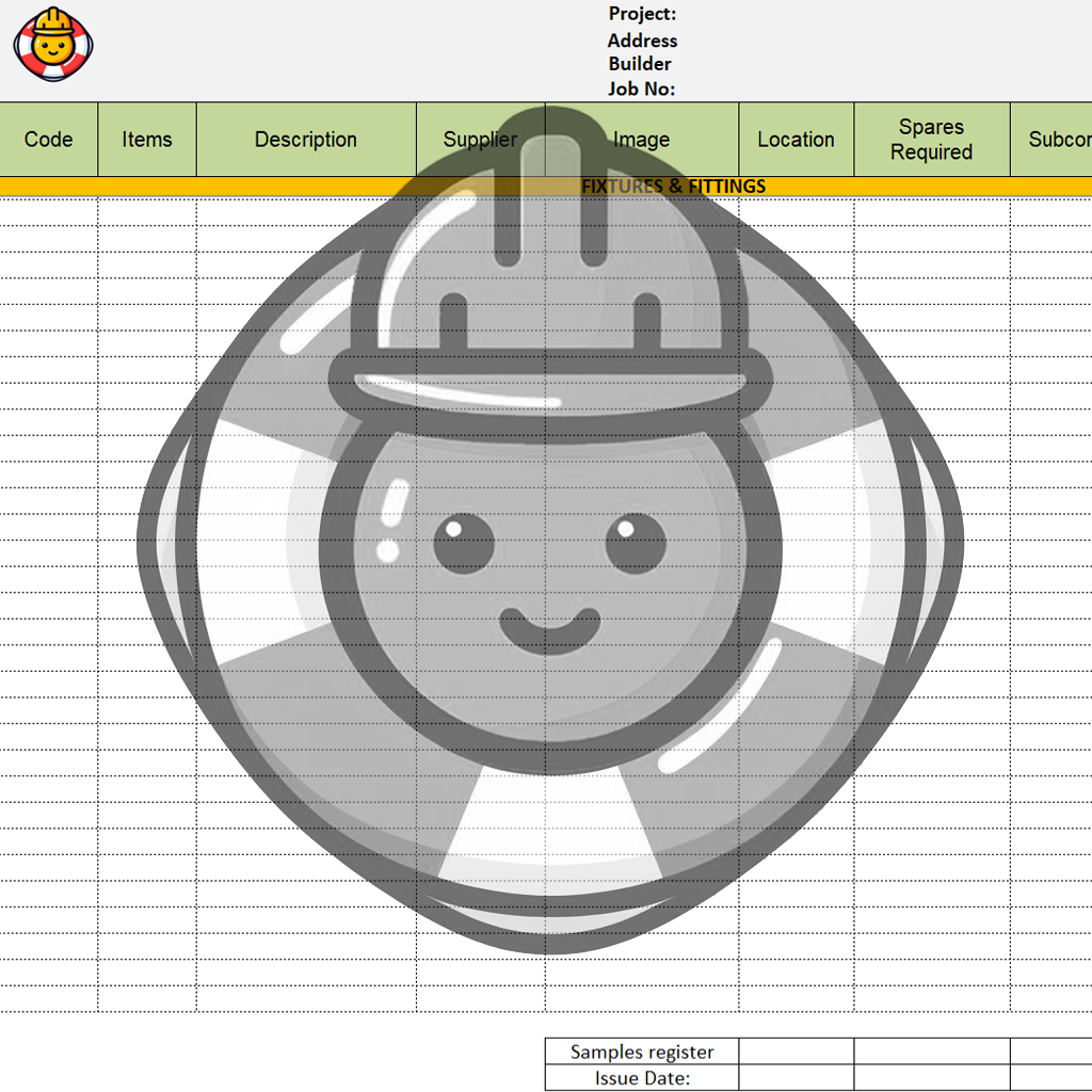 Sample and Spares register used for reviewing and listing the samples required for a project and for Client Sign-off. Also useful for tracking the spares required for each fixture and fitting.