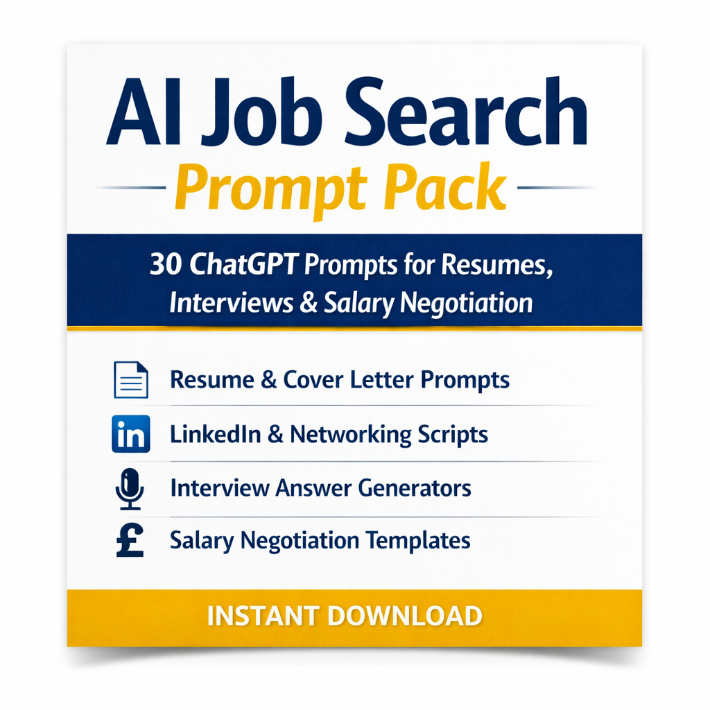 The AI Job Search Prompt Pack gives you 30 ready-to-use ChatGPT prompts to make your job search faster, easier, and more effective. Even if you’ve never used AI before, this pack helps you: