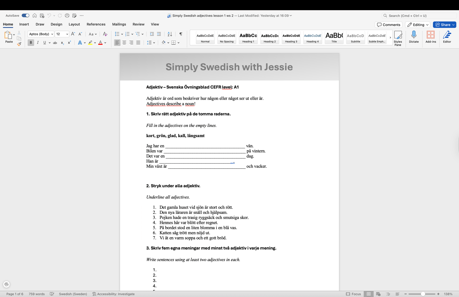 This A1 Swedish worksheet focuses on recognising and using adjectives in simple sentences. Learners practise filling in adjectives, underlining them in texts, identifying opposites, and writing their own descriptive sentences. The activities build basic vocabulary and help students feel more confident describing people, places, and things in everyday Swedish.