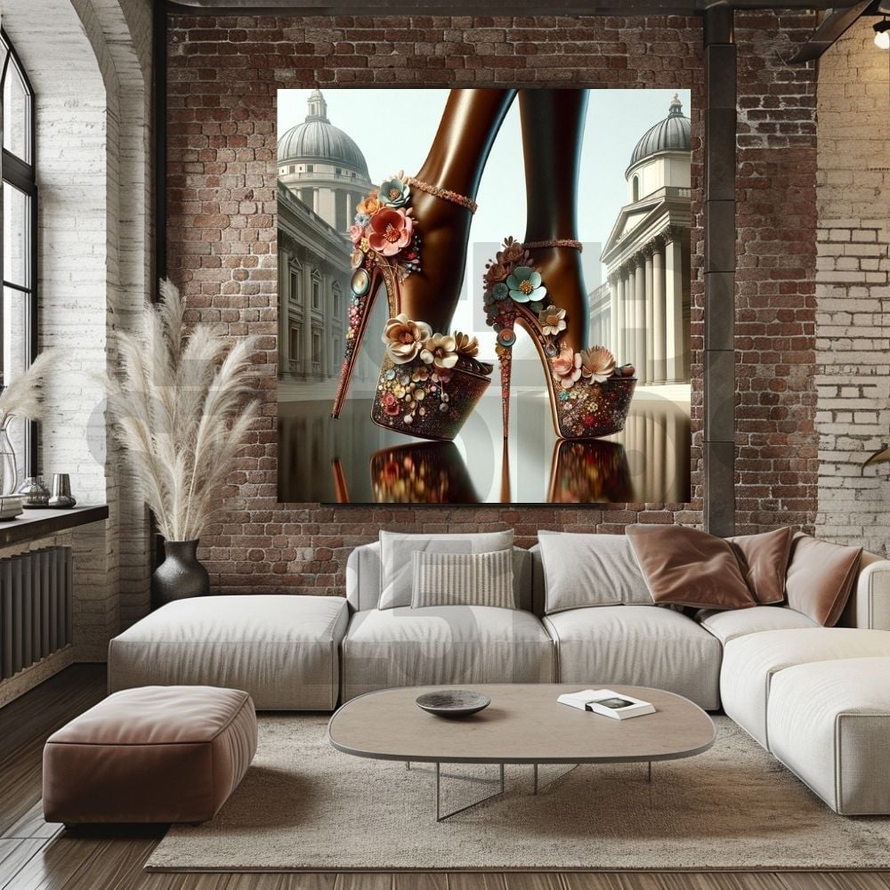 This wall art, titled "Neoclassical Bloom," features an exquisite pair of stilettos against a backdrop of grand neoclassical architecture. The shoes, adorned with a cascade of delicate flowers and shimmering embellishments, offer a modern twist on traditional elegance. This piece merges the timeless beauty of historic design with the allure of contemporary fashion, creating a visually stunning tribute to style through the ages. It's an ideal addition for those who seek to blend classic sophistication with modern luxury in their decor.