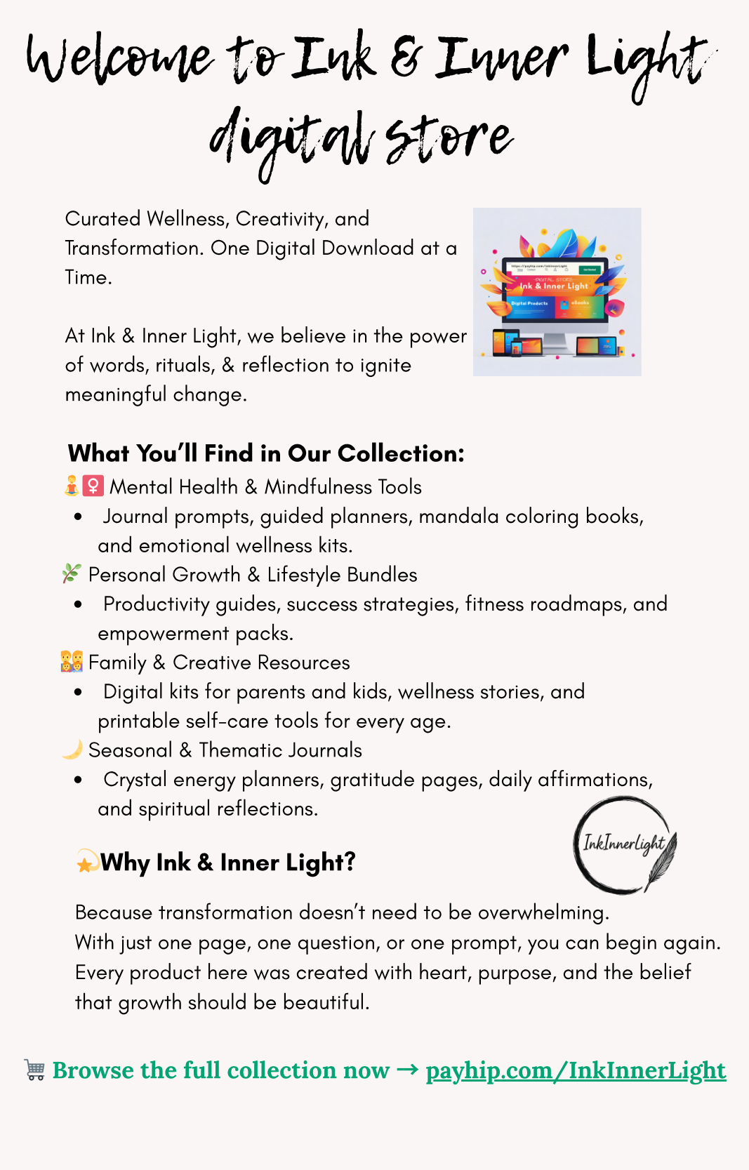Discover 100+ eBooks and digital tools for mindful living, creative growth, and soulful transformation. From wellness journals to children’s resources, everything here is designed to inspire clarity, calm, and personal empowerment — one beautiful page at a time.