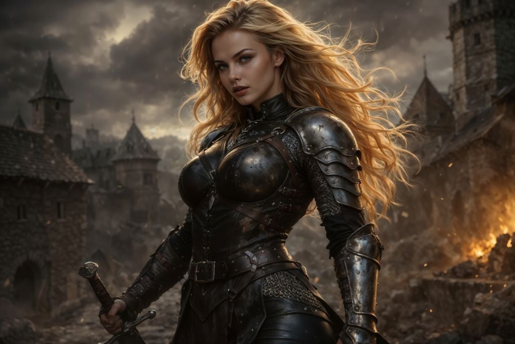 In ultra-sharp 10K resolution, every detail lands: the scuffed sheen of plate armor, chainmail texture, windswept hair lit by emberlight, and the smoky depth of a war-torn stronghold. This is the kind of artwork that doesn’t just decorate a space—it sets a mood.