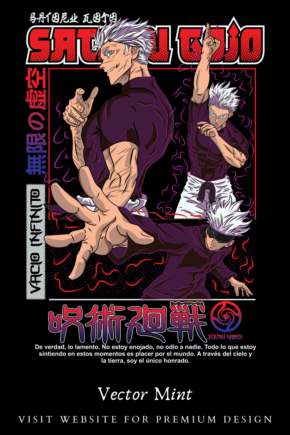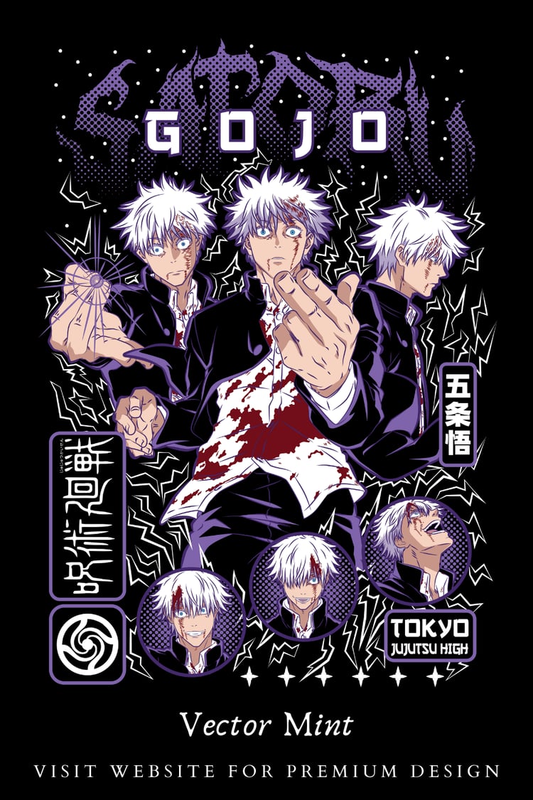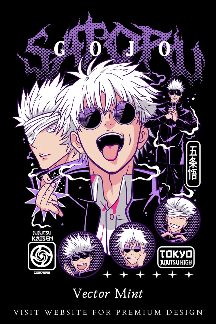 Gojo Satoru Jujutsu Kaisen Hollow Purple Anime Streetwear Graphic PNG Strongest Sorcerer Manga T-Shirt Design