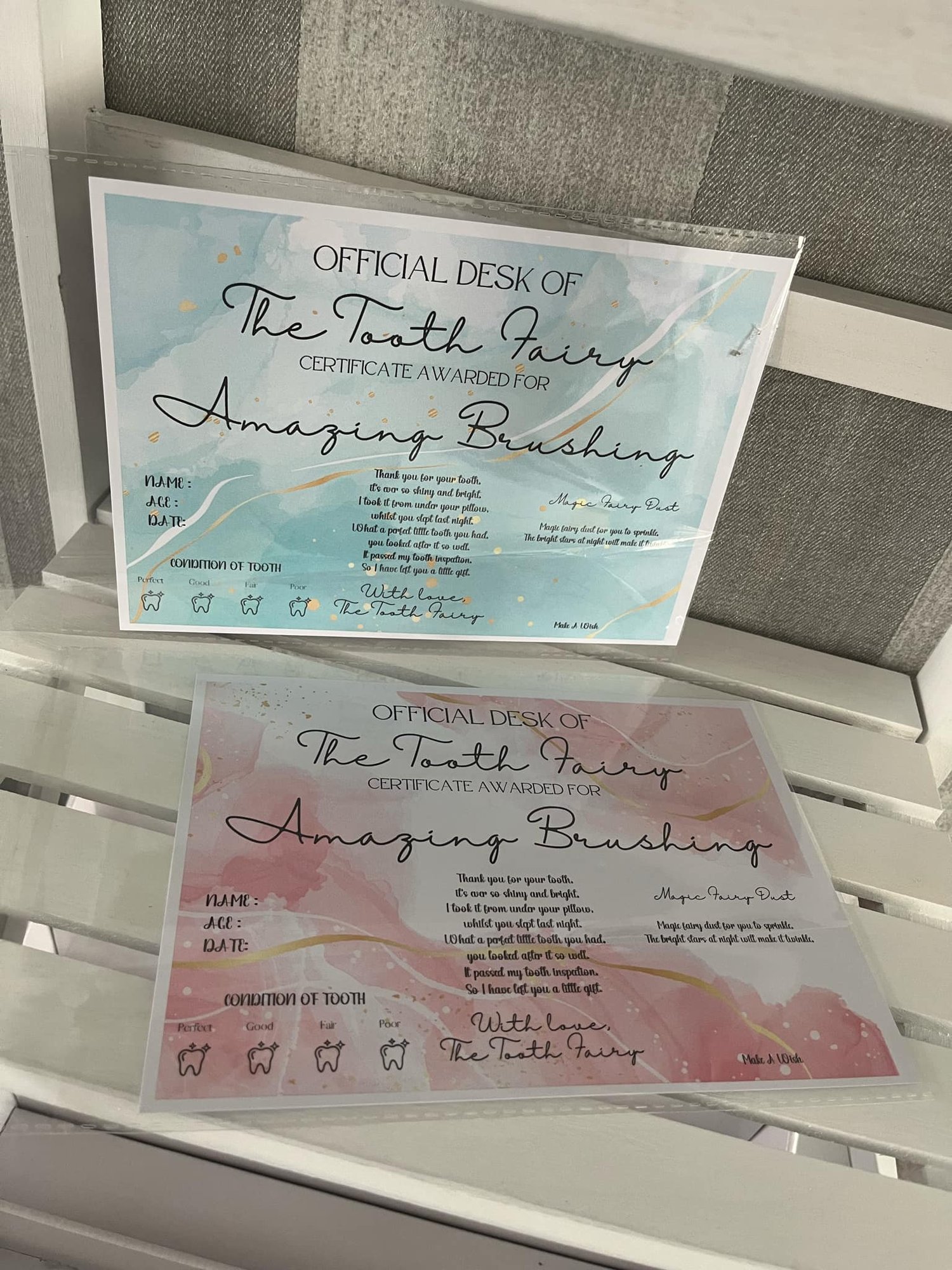 Every time a child loses a tooth, it's a special occasion, and something we can give is a positive reaction for those children. Here, we have a Purple, Green, and Pink certificate, which can come with a special tooth fairy coin in gold or silver. The coin will come in a small personalised bag.