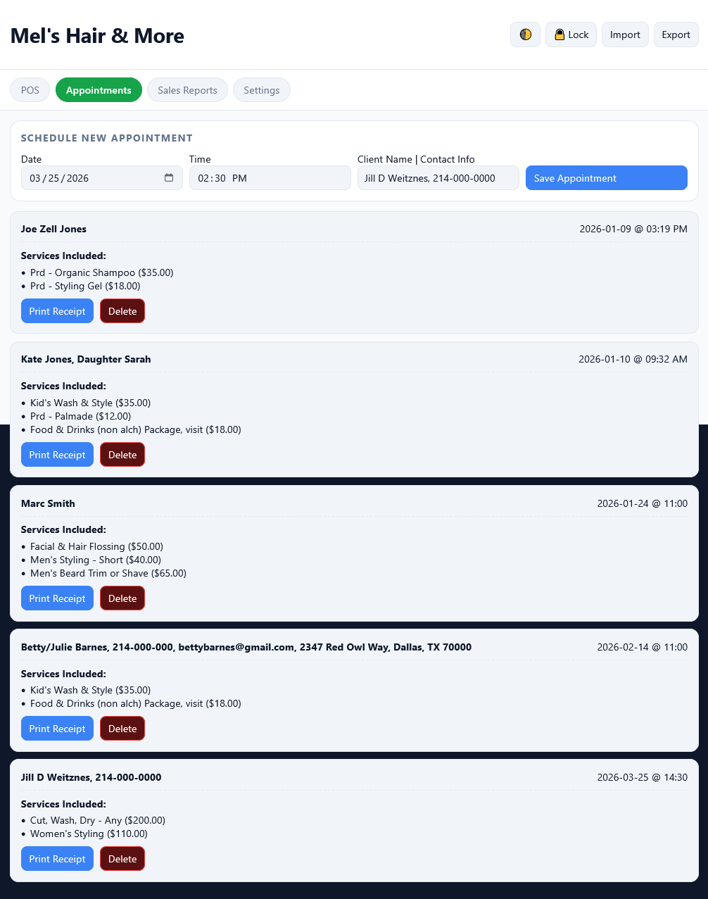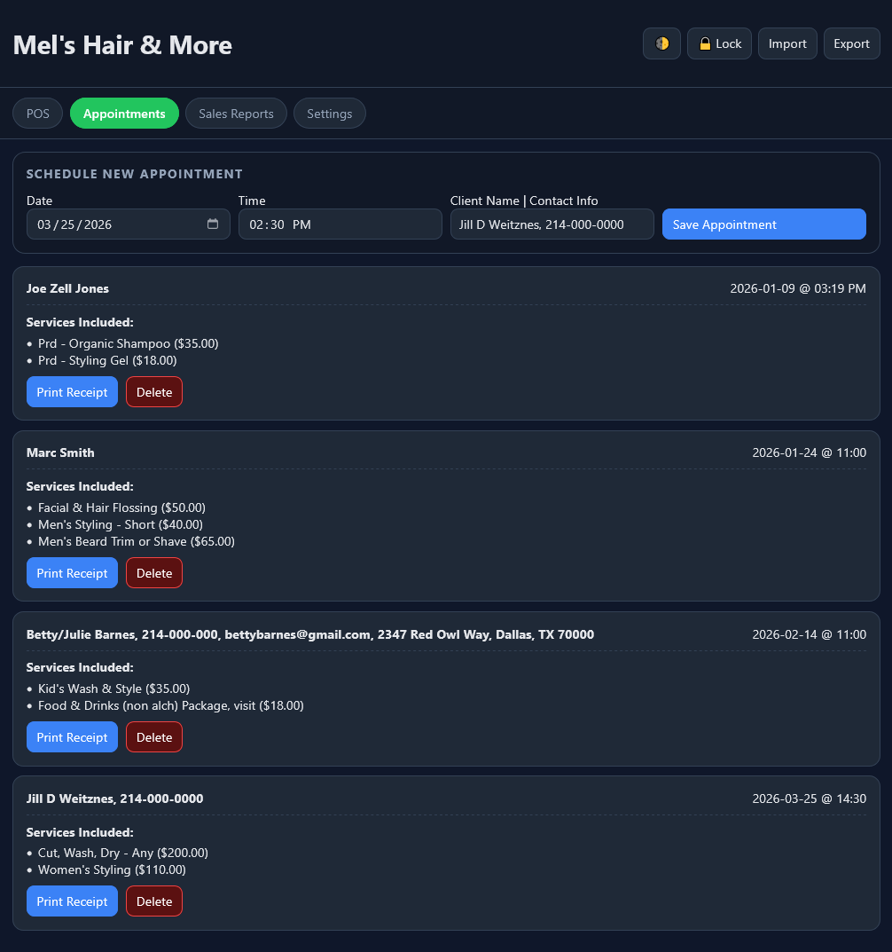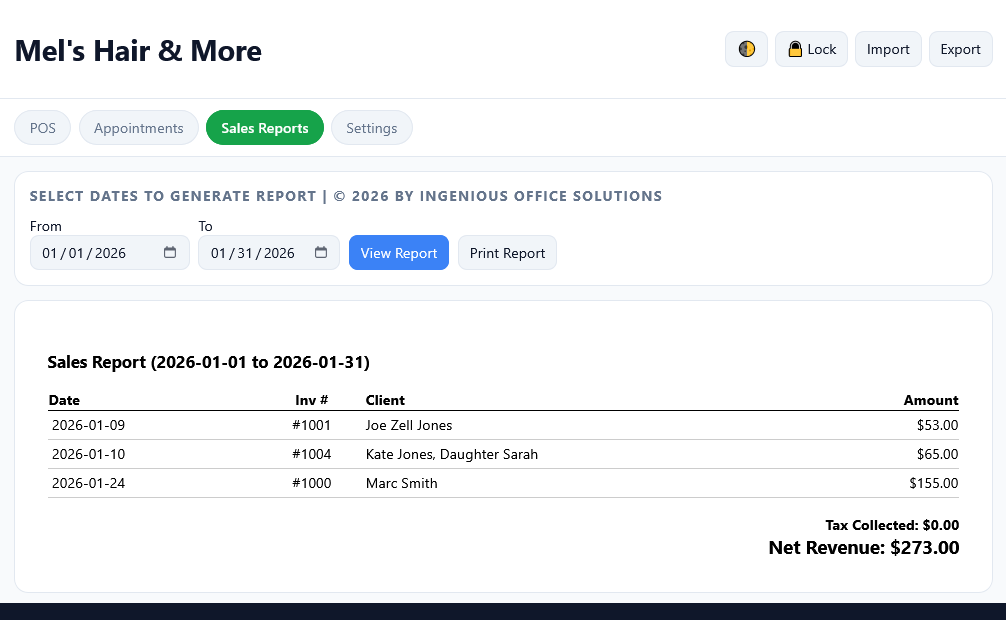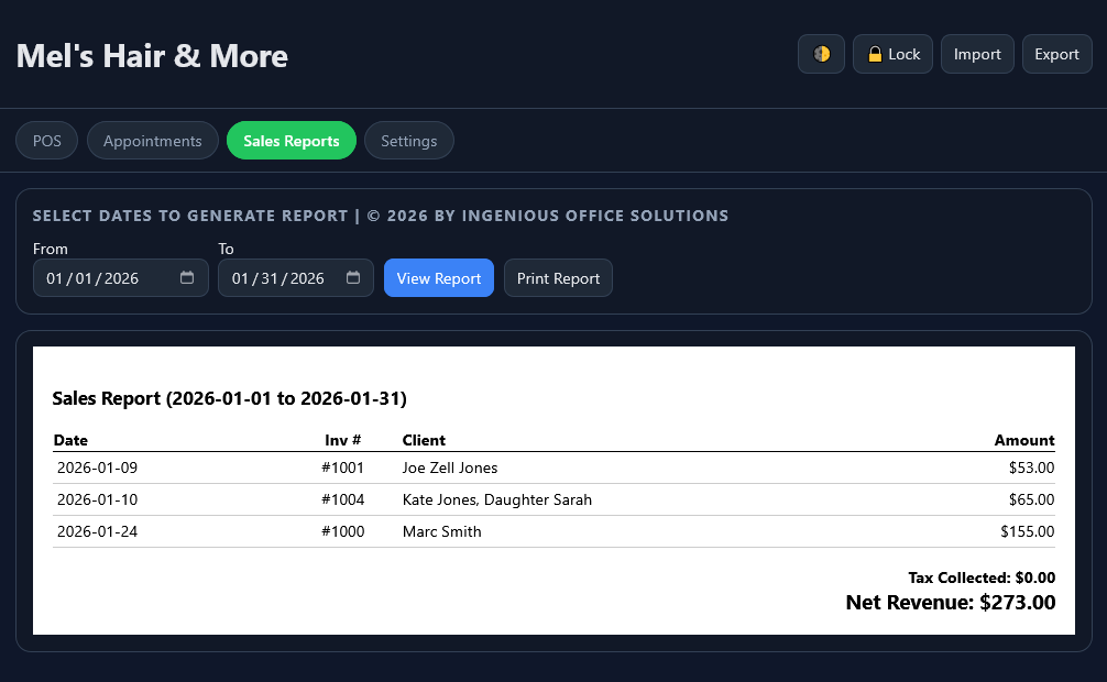 - Keep your schedule organized, track client information, generate professional printable receipts, and access clear sales reports whenever you need them.