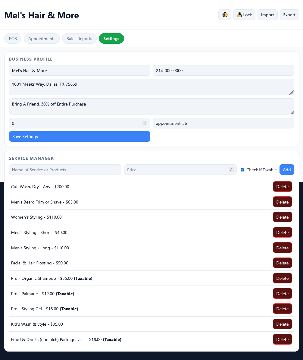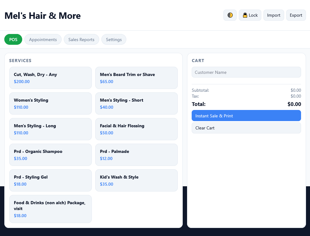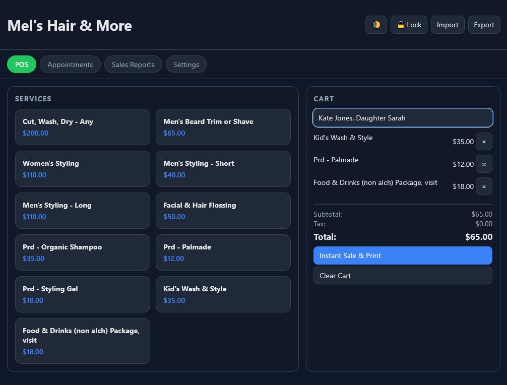 A powerful, easy-to-use offline system designed to help you manage appointments, clients, and sales — all with a simple one-time purchase. For small appointment based businesses, includes an integrated Point of Sale (POS) system.