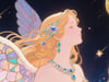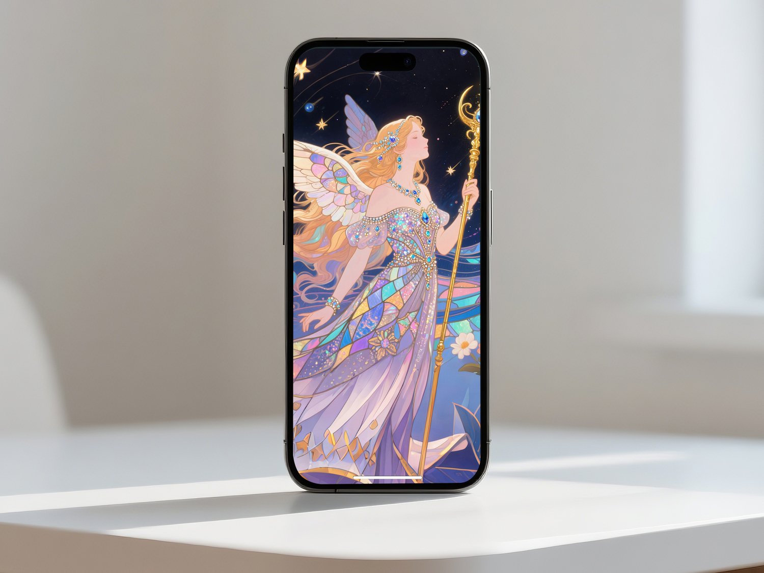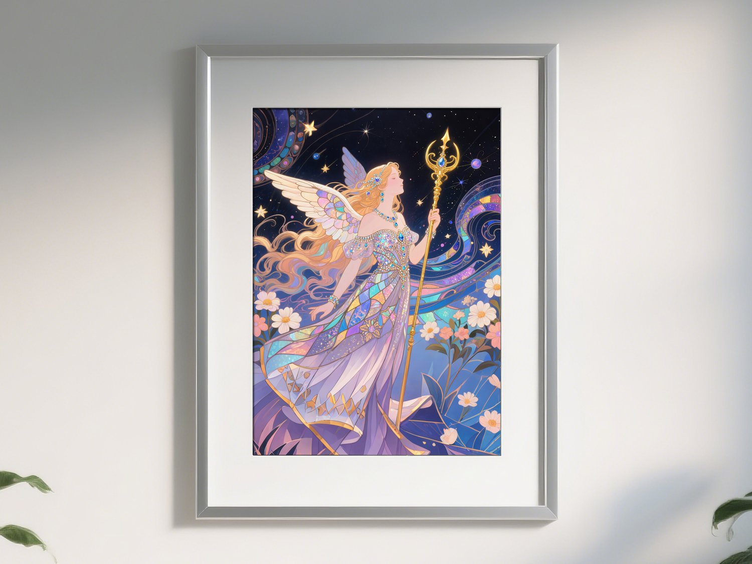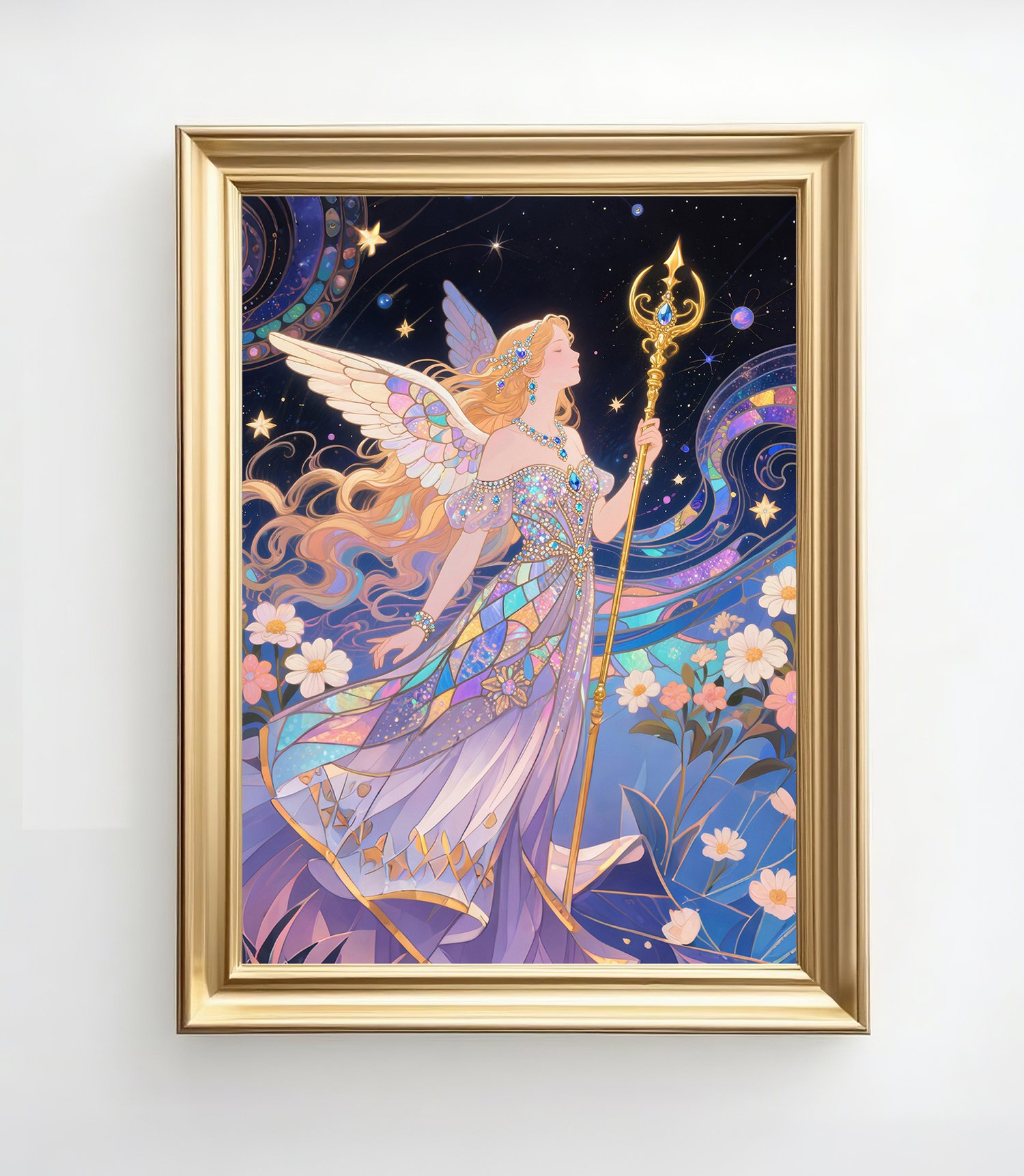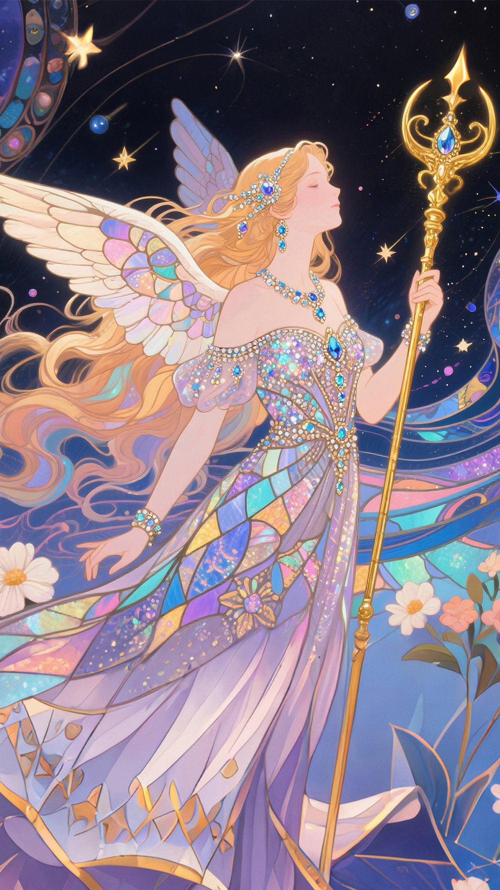 A beautiful angel with flowing hair, sparkling jewels, and a noble golden staff appears in a magical scene surrounded by blooming flowers, shimmering stars, cosmic waves, swirling patterns, and luxurious celestial motifs.