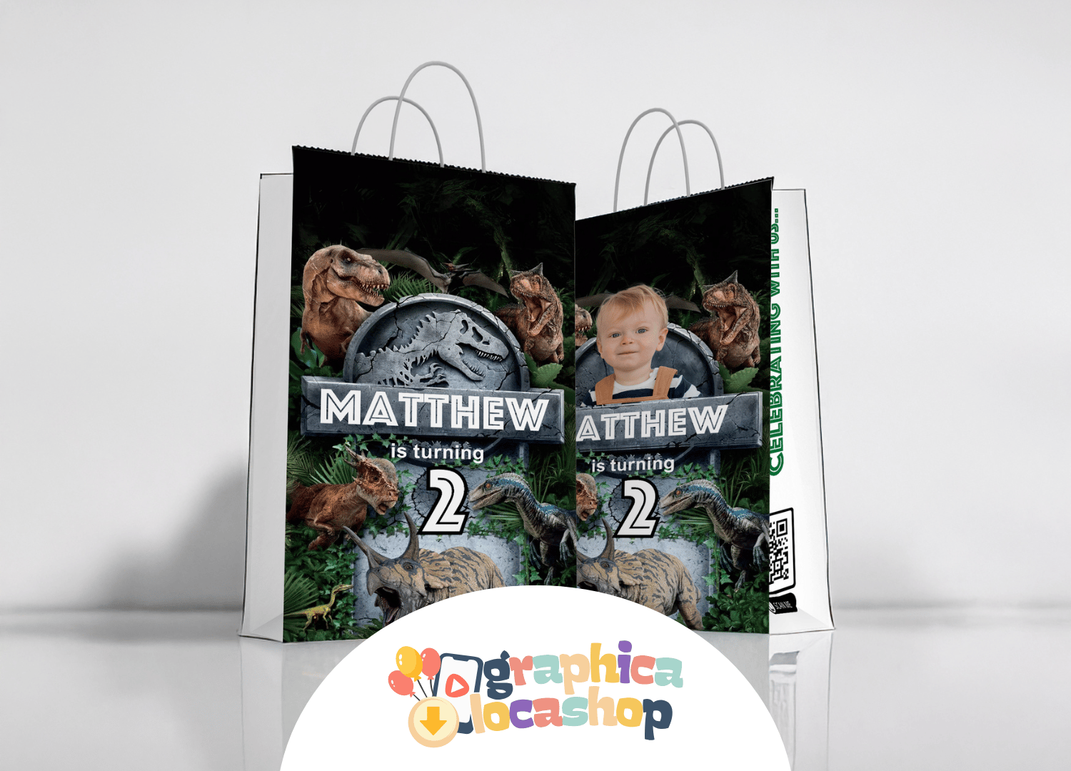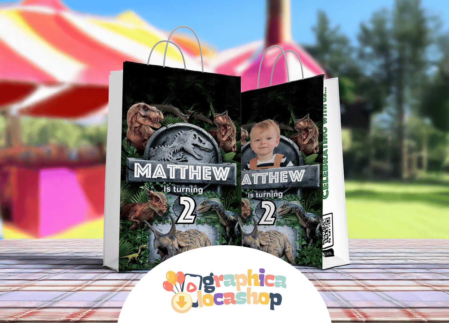 Designed with bold jungle leaves, fierce dinosaurs, and adventure-style fonts, this loot bag is perfect for Jurassic Park-inspired birthdays, dino-themed parties, or prehistoric celebrations.